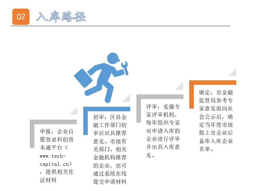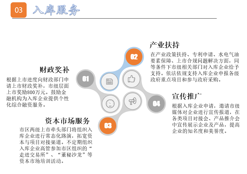 成功入库企业可根据上市进度,提供相关佐证材料,向财政部门申请上市奖补。金融监管部门也将为入库企业降低融资成本提供服务。此外,各行业主管部门也将出台支持入库企业的具体政策,在生产要素上进行保障,优先推荐评选相关奖项,倾斜科研项目资助等。