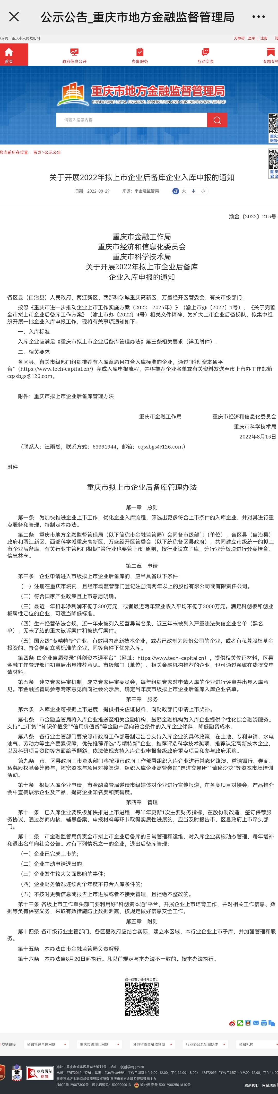 重庆市金融工作局、重庆市经济信息委和重庆市科技局三部门联合发出《关于开展2022年拟上市企业后备库企业入库申报的通知》,企业可对照《通知》要求条件自行申报。