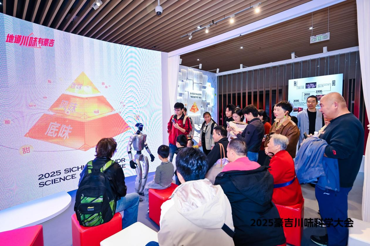 从“苏东坡”IP引领的寻味之旅,到沉浸值拉满的24种味型深度解析,观众逐步构建完整的川菜味型认知。互动区域,观众可在屏幕上观察“味型金字塔”结构变化,直观理解标准带来的精确控制。团标艺术装置区则将24种味型的标准文献转化为视觉艺术装置,展现麻辣、鱼香、怪味等味型的科学内涵。宇树机器人通过人机互动,将复杂味型理论转化为通俗语言,实现个性化观展。