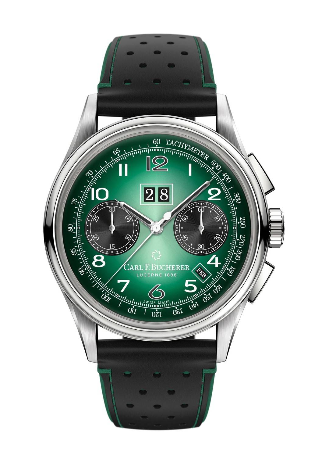 传承系列年历双盘计时码表城市版 (Heritage BiCompax Annual Hometown) 绿色表盘采用太阳纹拉丝工艺,黑色小秒针和计时小表盘与表盘颜色形成反差,别具一格。表盘边缘设有测速刻度,计算时光更迭,留下每一帧的动人故事。