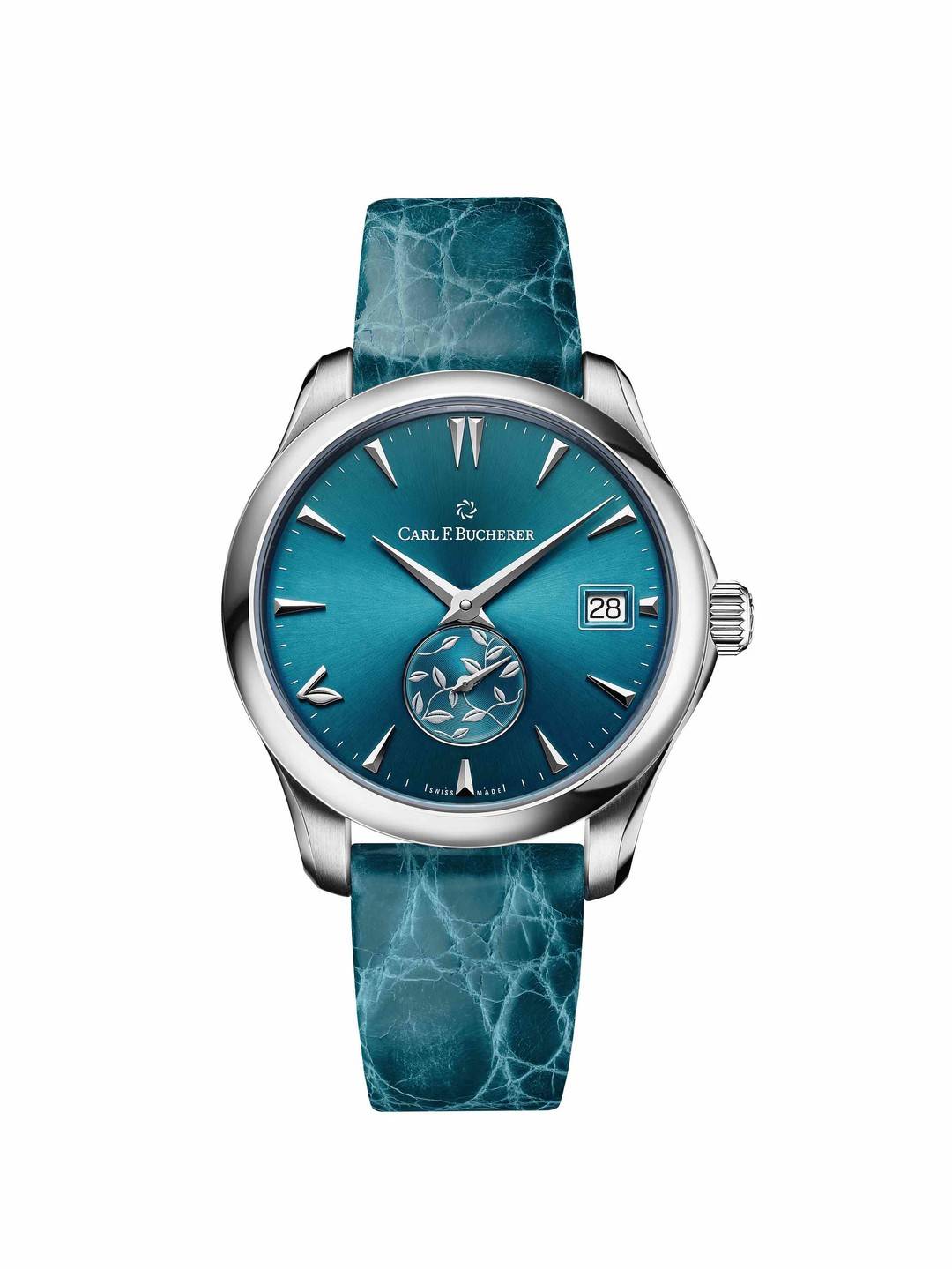 因爱而生的马利龙自动日历LOVE腕表 (Manero AutoDate LOVE) 寓意美好,蓝绿色表盘清凉宜人,搭配同色系鳄鱼皮表带,素银叶片装饰的6点位小表盘,任甜蜜时光在简约表盘中静静流淌。