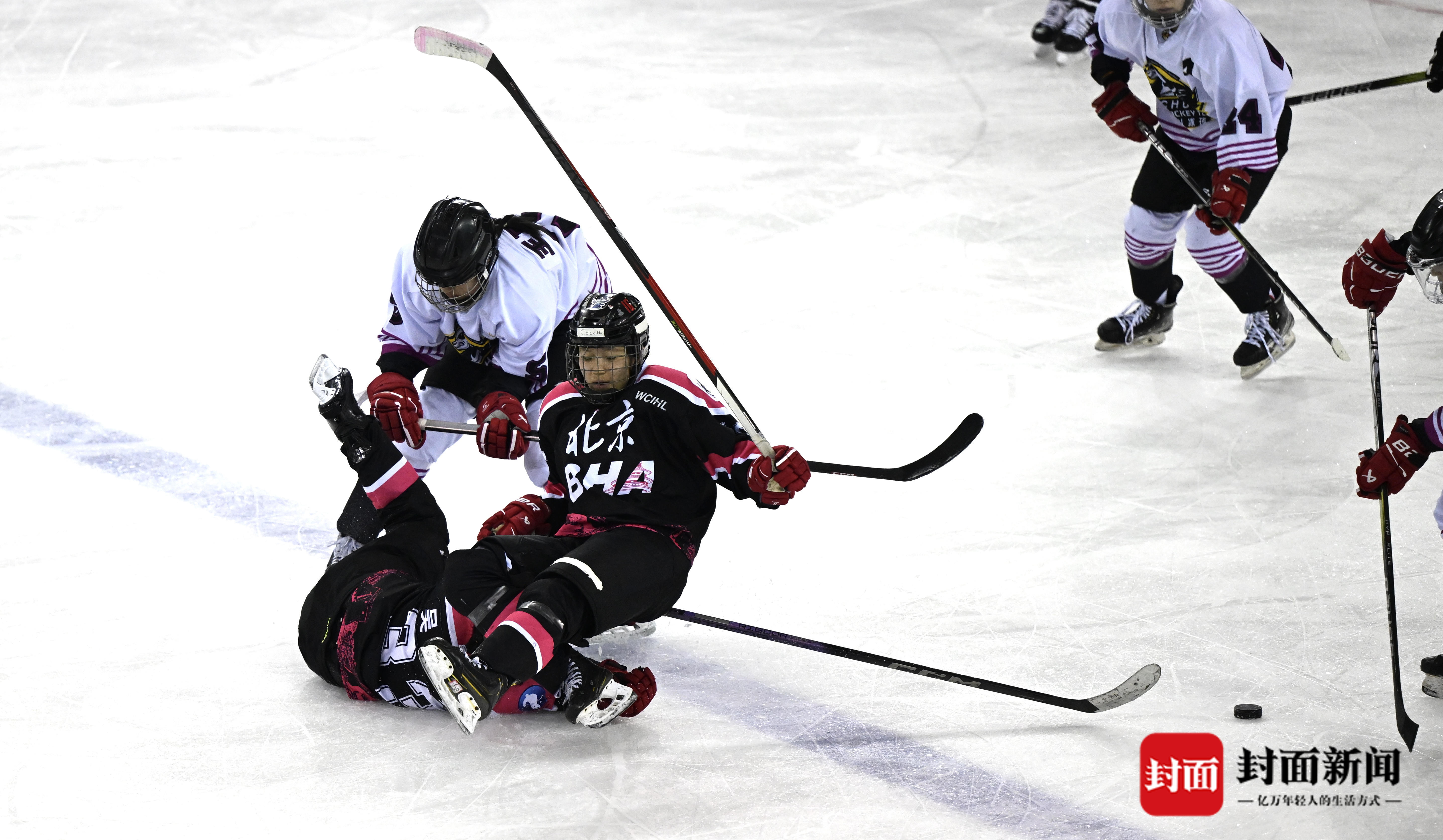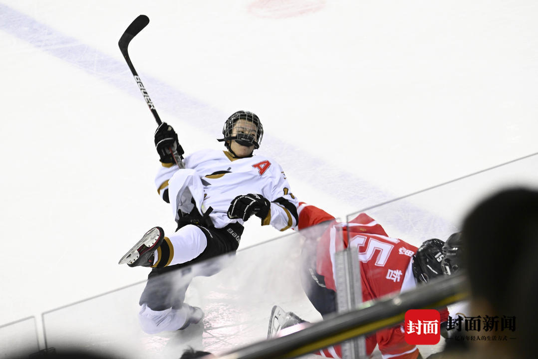 四川青年女子冰球队在决赛中与北京队激烈争夺