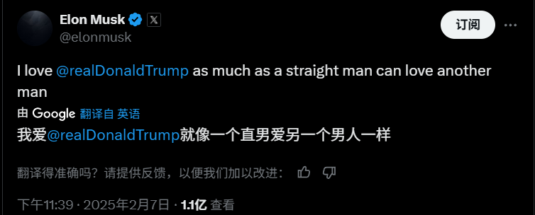 在两人情谊的高峰期,今年2月,马斯克曾经发文称:“我爱特朗普,就像一个直男可以爱另一个人一样。”
