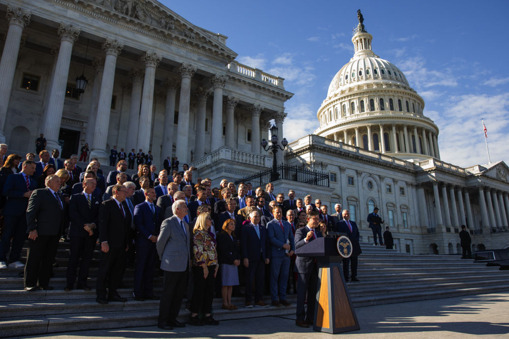 10月25日,在美国华盛顿国会外,新当选的众议院议长迈克·约翰逊(前)发表讲话。新华社发(亚伦摄)