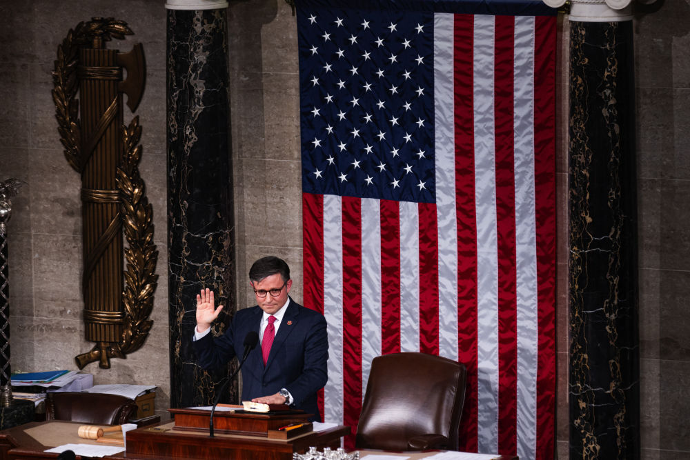 10月25日,在美国华盛顿国会,新当选的众议院议长迈克·约翰逊宣誓就职。新华社发(亚伦摄)
