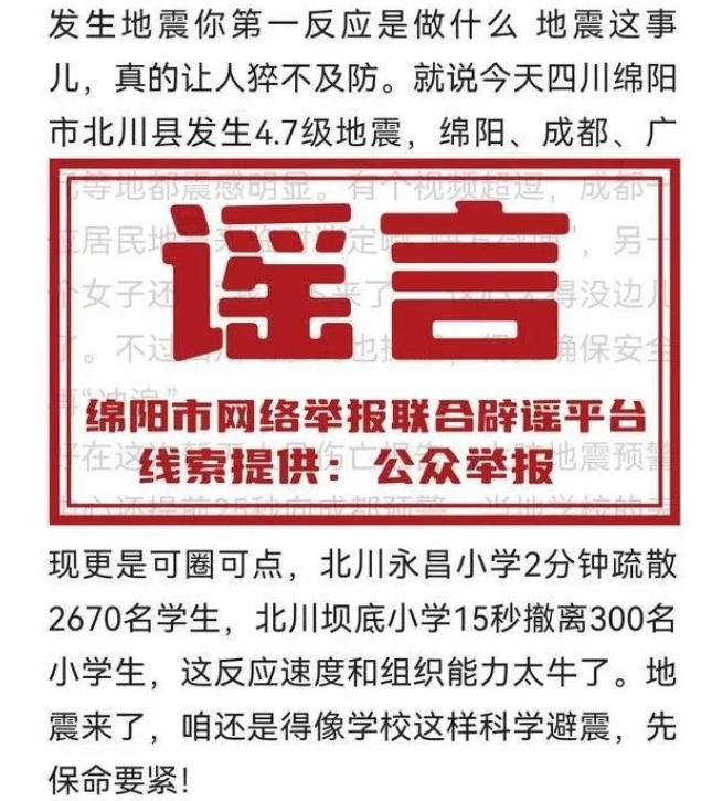 4月1日下午14时许,接网民举报,有帖文称“绵阳市北川县发生4.7级地震,绵阳、成都、广元等地震感明显,暂无人员伤亡报告”。经查中国地震台网,帖文内容纯属谣言,四川省未发生4.7级地震或与地震相关的紧急情况。