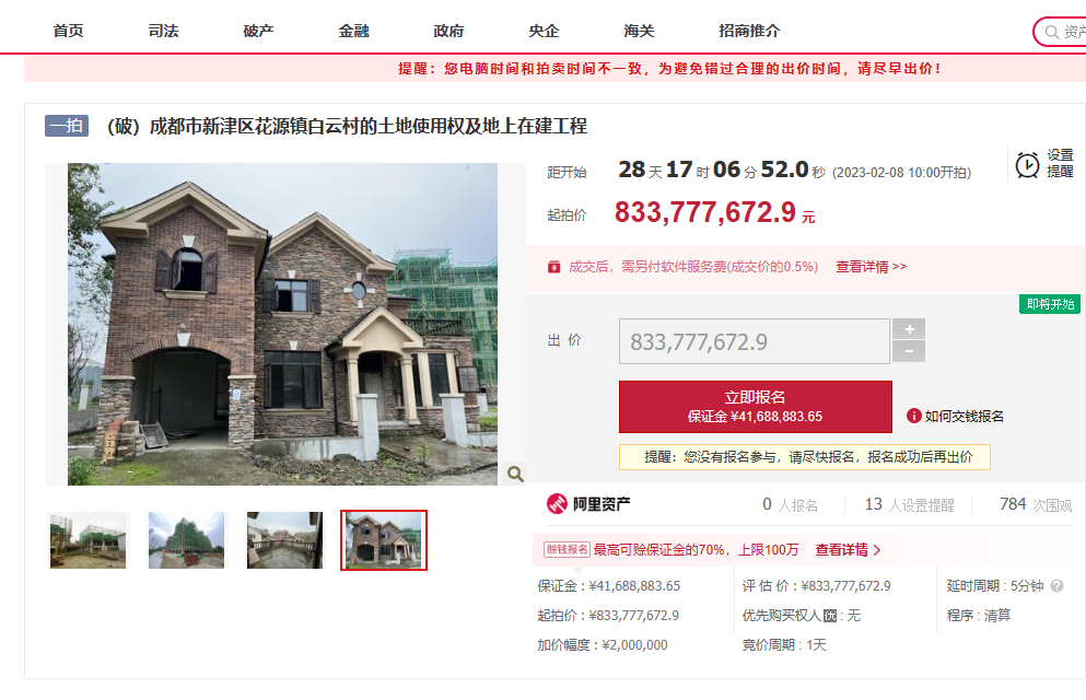 1月9日,阿里资产网站显示,成都市新津牧马山173亩的香榭湾项目将在2月8日启动土地及在建工程的拍卖,起拍价约8.3亿元。