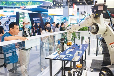 9月4日,在服贸会综合展区,参观者正在观看智能焊接机器人工作。 翁奇羽摄(人民视觉)