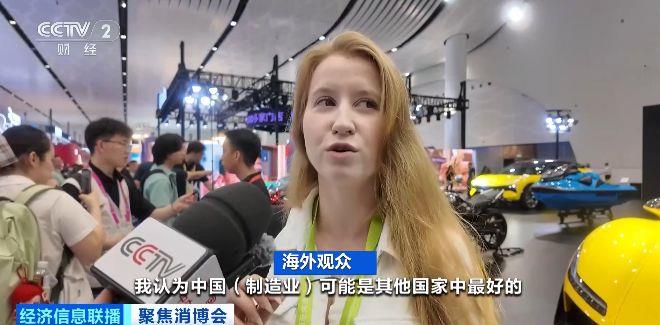 海外观众:我认为中国制造业可能是其他国家中最好的,他们有很多东西,比如机器人、摩托车、汽车。看看这届消博会这么大,这么多东西, 有这么多机器人,还有机器狗,看起来真的很好。