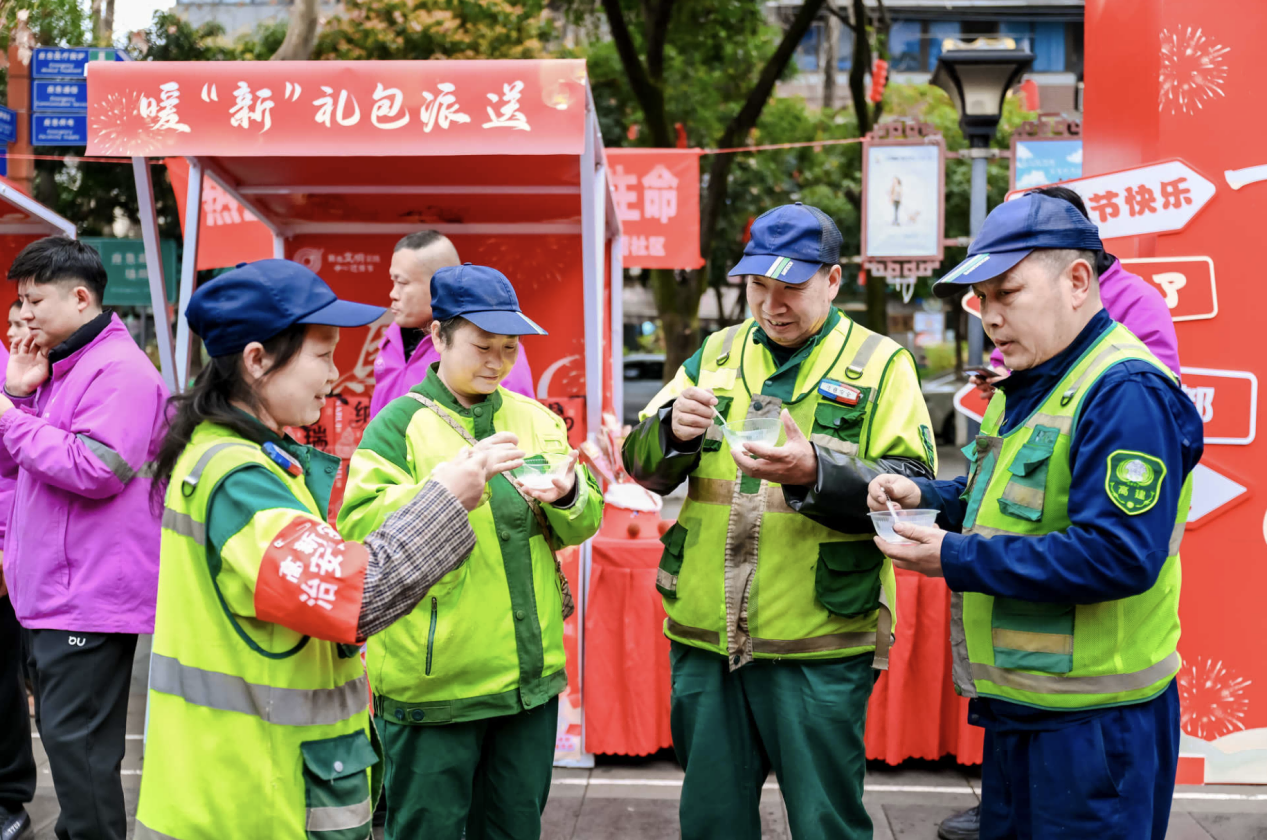 元宵能量补给站前,志愿者将印着“致敬城市奋进者”的热汤圆递到快递小哥、环卫工人手中。