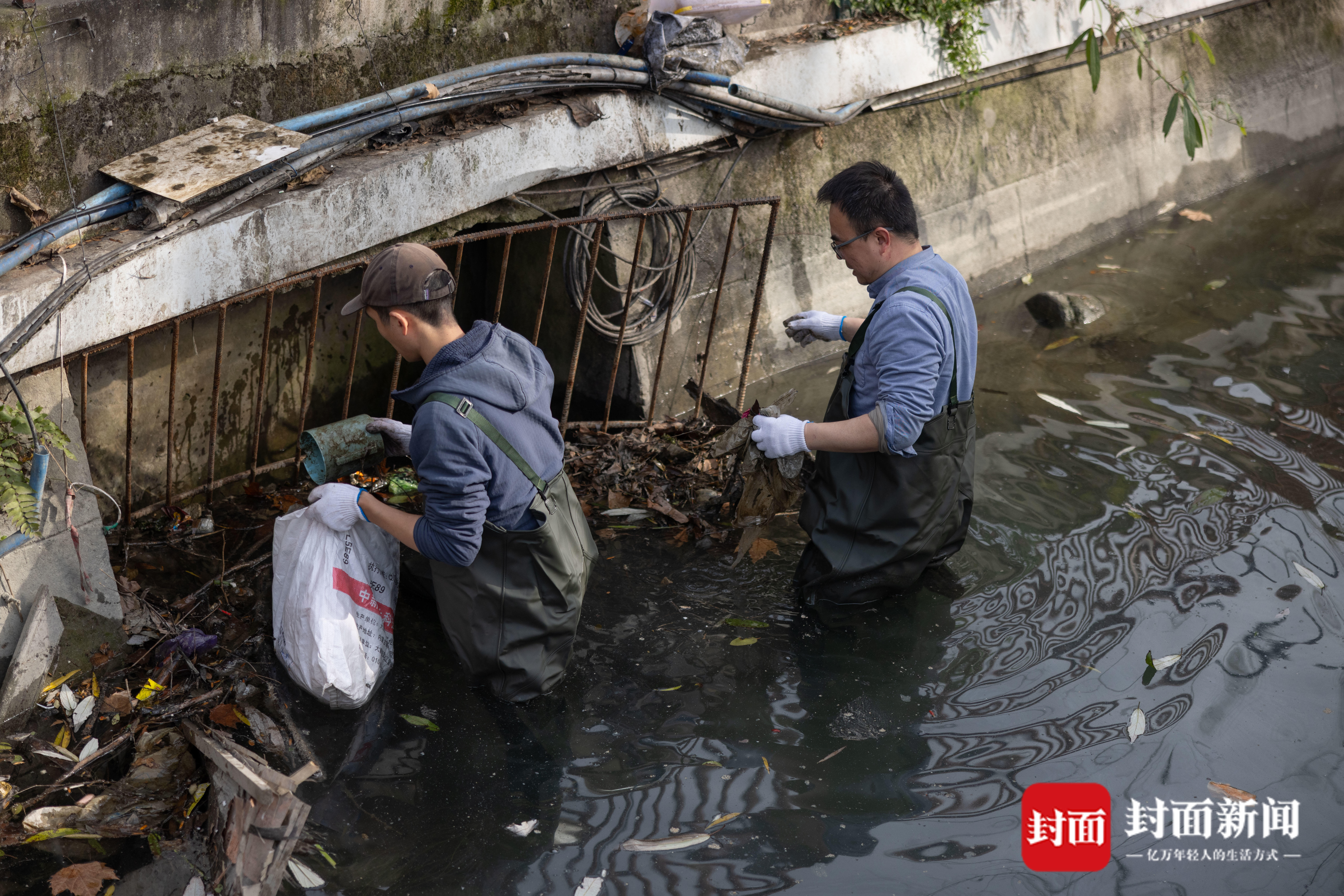 2026年1月26日,成都都江堰市,余欢(左)和张凌青(右)在一条人工沟渠里清理杂物。欧亚水獭正是通过这样的人工渠道在人工池塘和天然河道之间通行。封面新闻记者 杨涛 摄