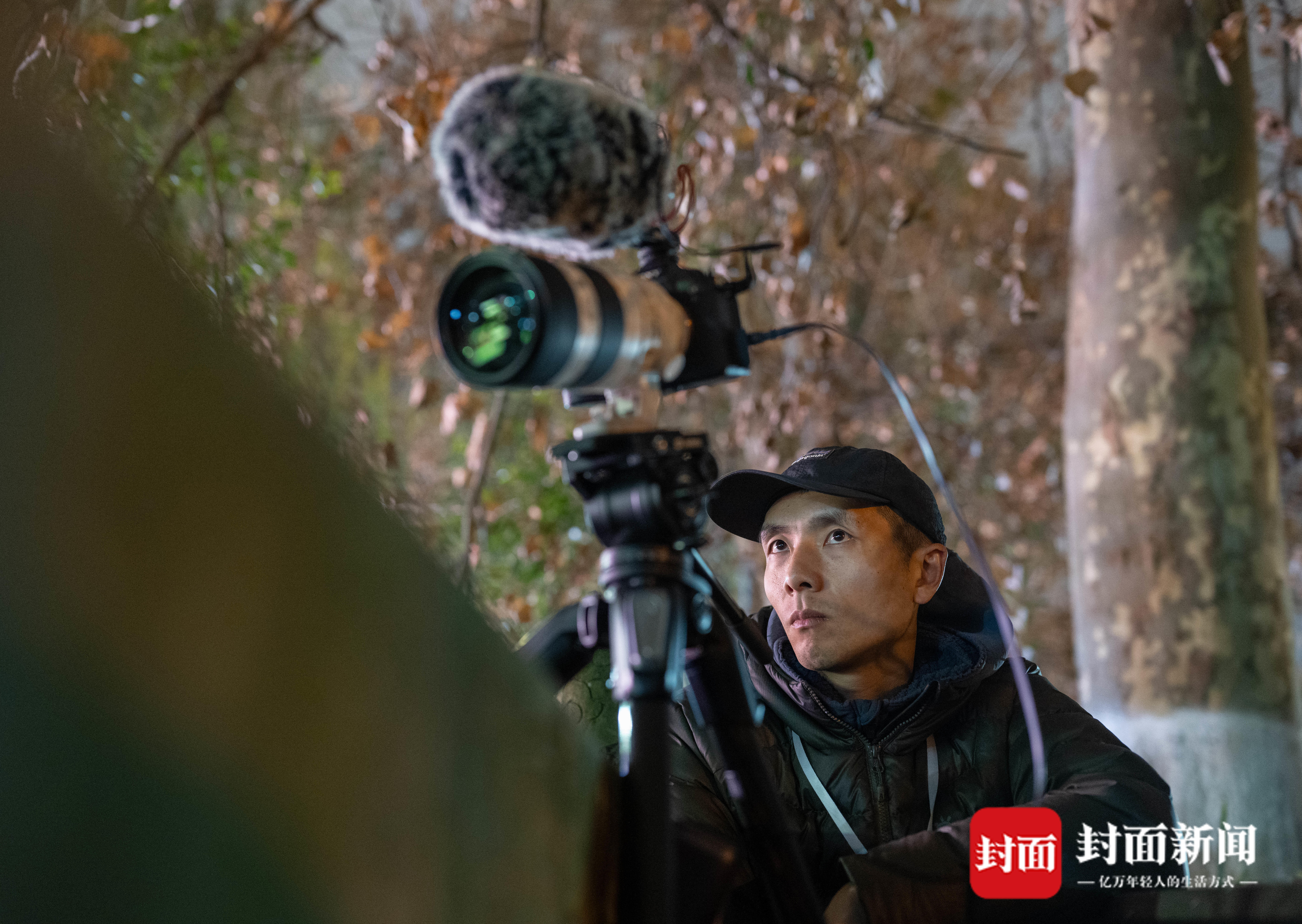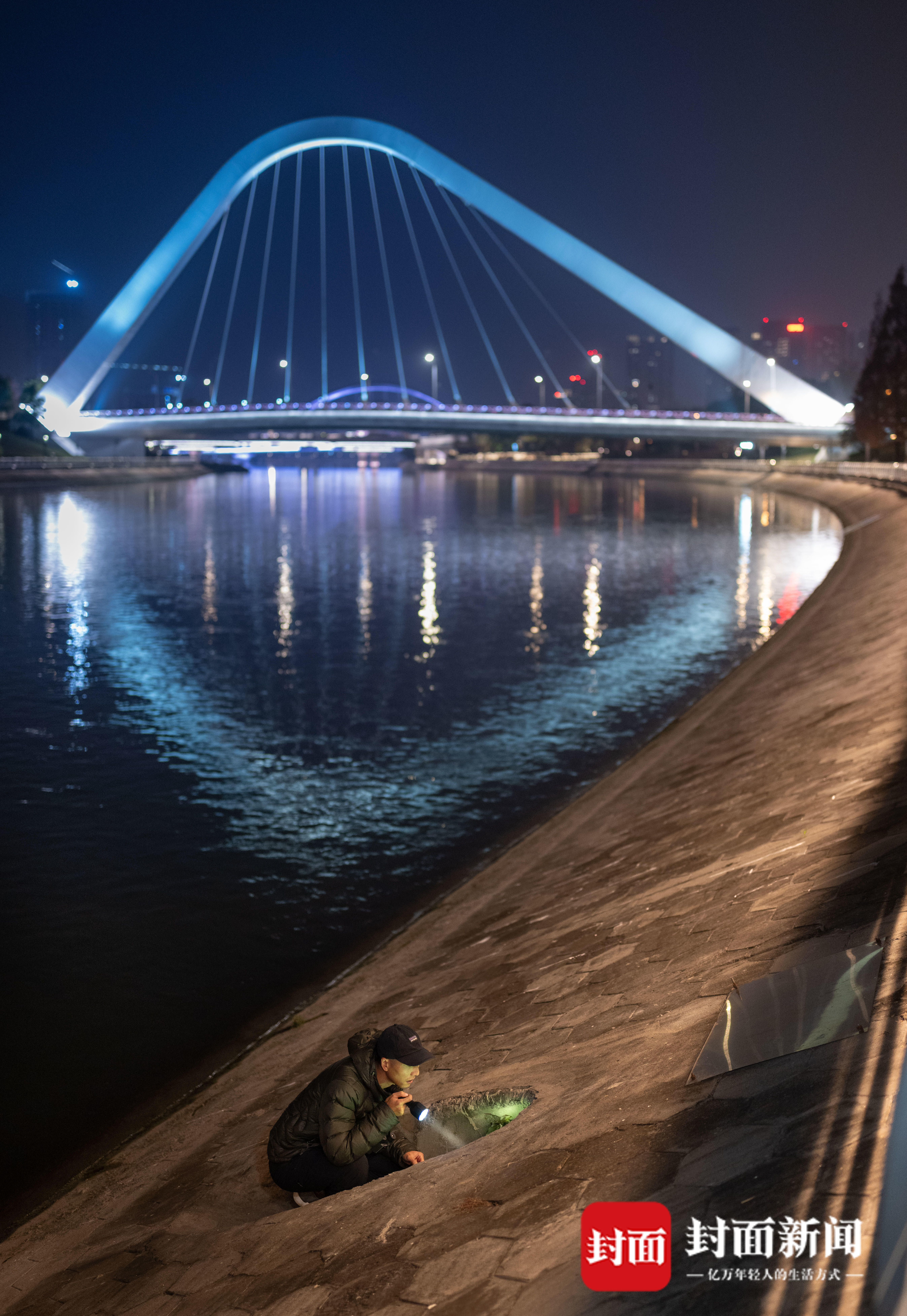 2025年12月23日,成都都江堰市,余欢在深夜里蹲守欧亚水獭。欧亚水獭是夜行性动物,观察和拍摄的难度很高。封面新闻记者 杨涛 摄