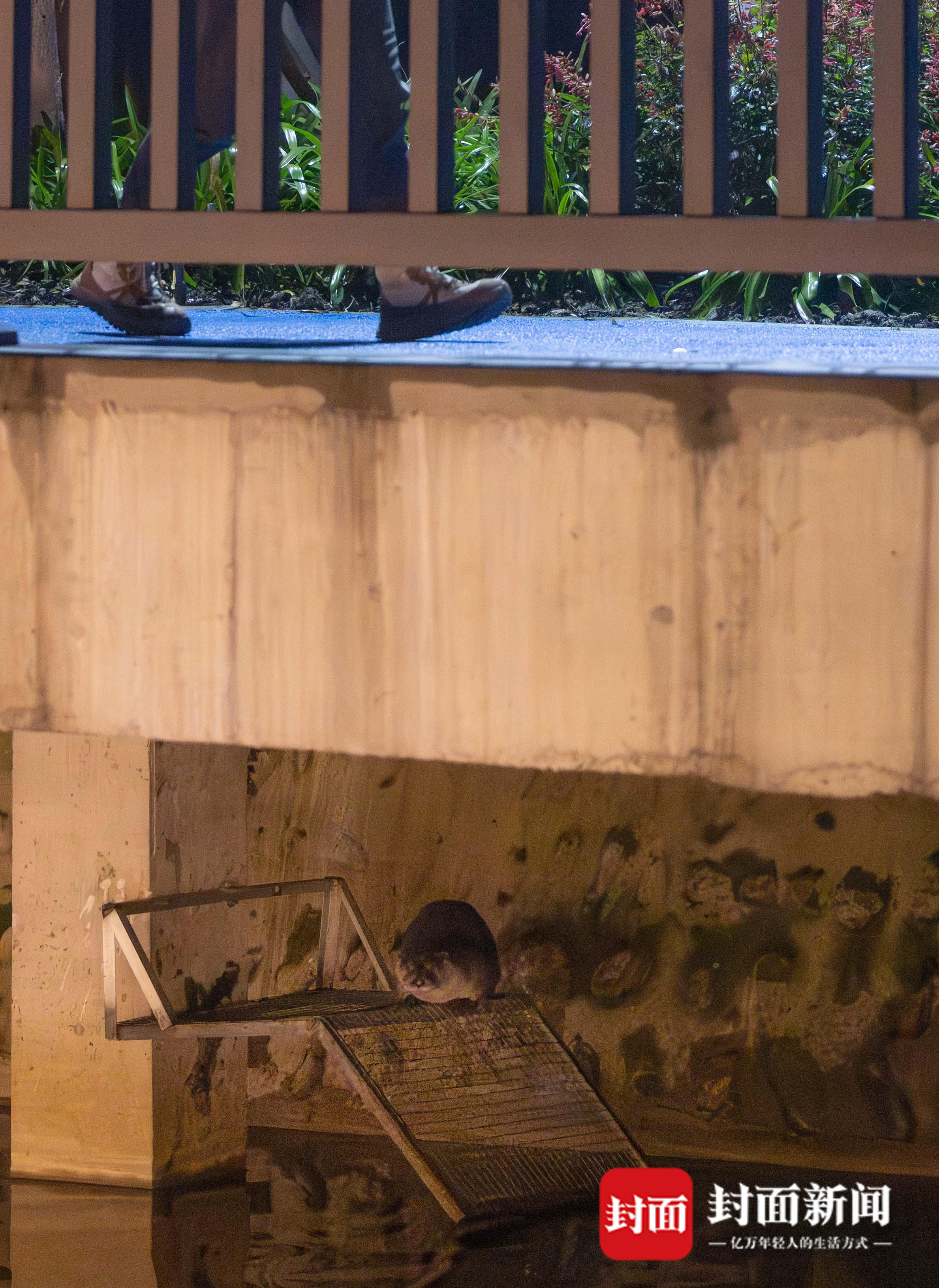 距离烧烤摊不到两米的护栏上,一台红外相机正无声地记录着另一个世界:一个流线型的黑影从排水渠跃出水面,利用强健的尾巴作支撑,从几乎笔直的河堤上岸。这只欧亚水獭摇摆着身躯,跨过一段人行道,在陆地上行进了五六米的距离,轻车熟路地跃入一个人工池塘里。