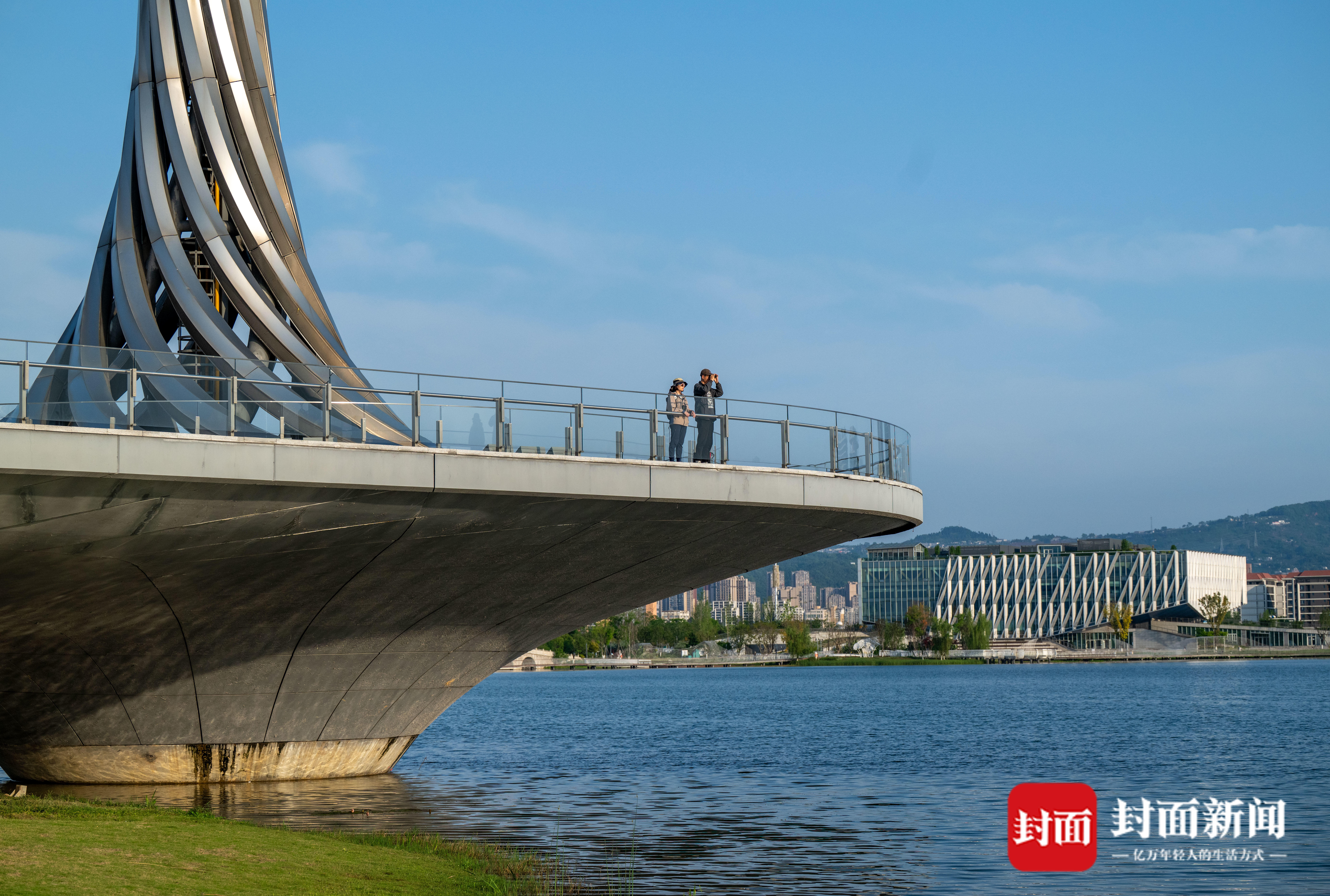2026年4月14日,成都市东安湖,胡敏团队在岸边寻找欧亚水獭可能出现的地方,欧亚水獭在东安湖水域也有目击报告。封面新闻记者 杨涛 摄