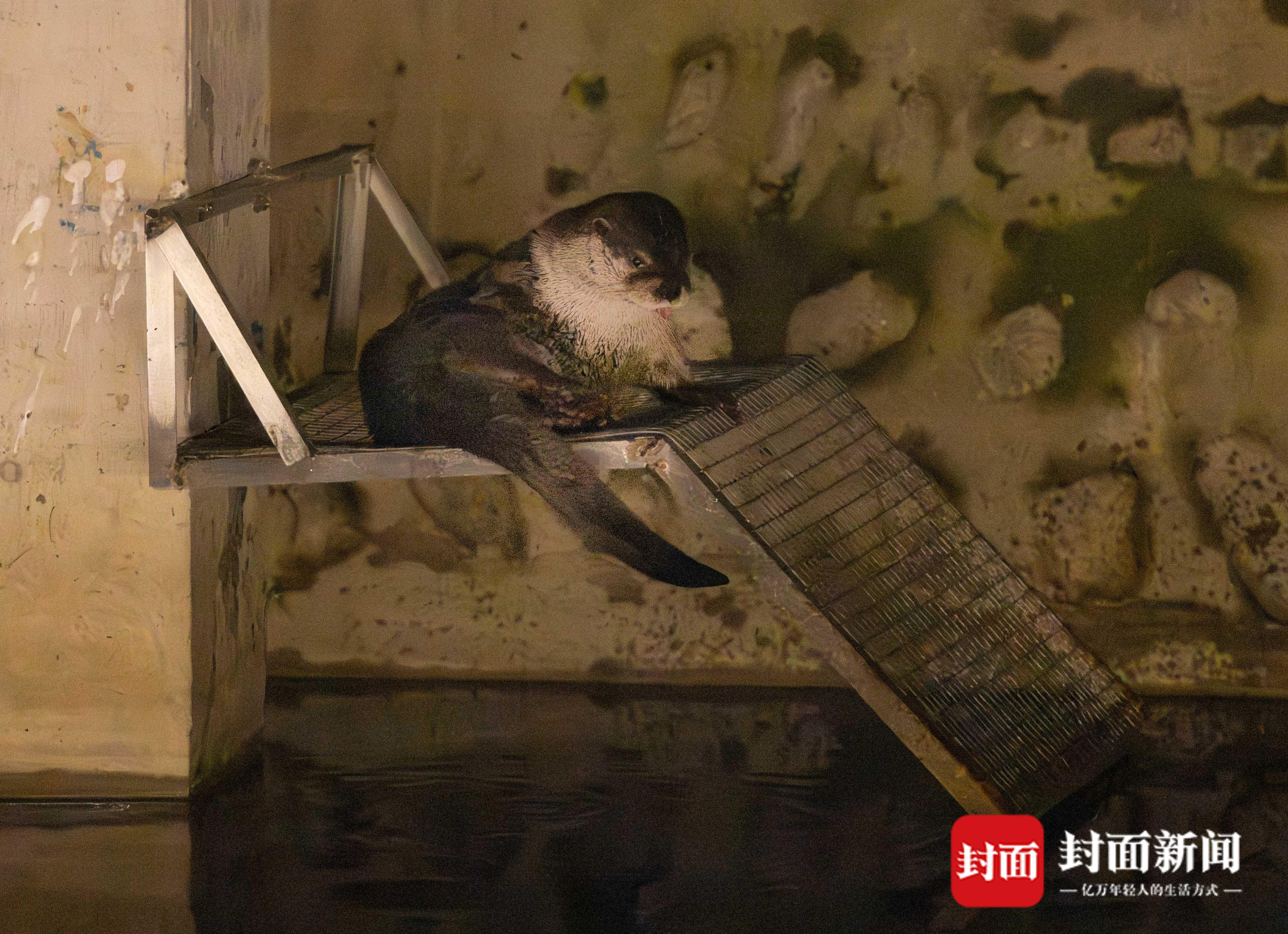 2026年2月2日深夜,成都都江堰市一处人工池塘,一只欧亚水獭在这里休息。这只欧亚水獭从人工水渠上岸,穿越绿化带来到池塘觅食。封面新闻记者 杨涛 摄
