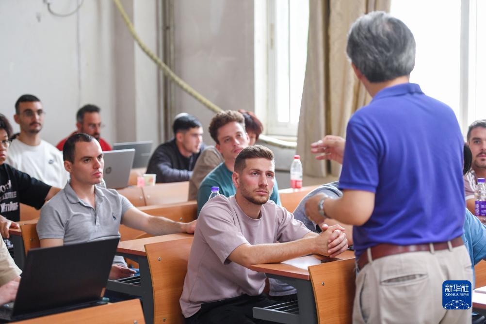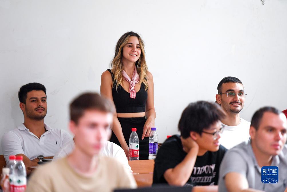 8月7日,在位于北京的对外经贸大学本部,对外经贸大学以色列分校学生比顿(后排中)上课时回答问题。新华社记者 鞠焕宗 摄