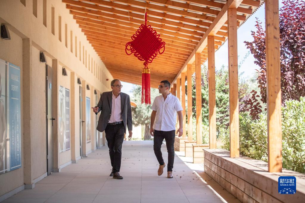 8月8日,在以色列中部城市佩塔提克瓦,对外经贸大学以色列分校副校长内塔内尔·瓦克宁(右)与副校长加迪·拉维德走在分校校园里。新华社记者 陈君清 摄