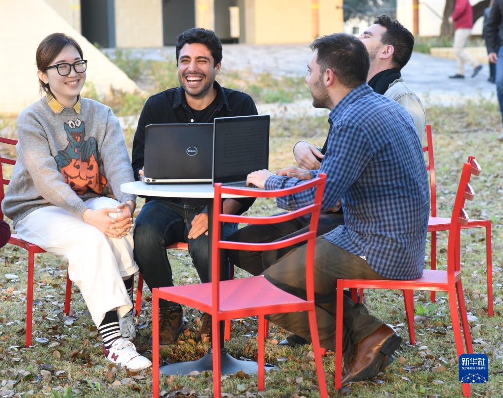 2022年2月1日,中以学生在位于以色列中部城市佩塔提克瓦的对外经贸大学以色列分校校园里热烈讨论。新华社发