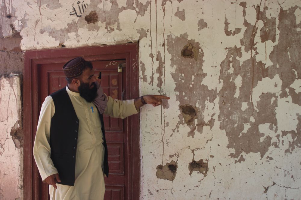 7月30日,在阿富汗楠格哈尔省赫萨拉克地区,一名村民指出美军空袭留下的痕迹。(新华社发艾马尔·查希尔摄)