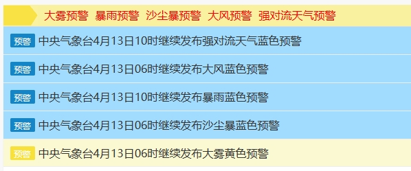 今早(4月13日),中央气象台5预警齐发:暴雨+沙尘暴+强对流天气+大风蓝色预警,还有大雾黄色预警。