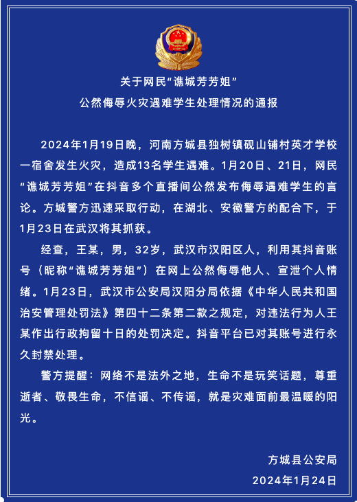 通报称,2024年1月19日晚,河南方城县独树镇砚山铺村英才学校一宿舍发生火灾,造成13名学生遇难。1月20日、21日,网民“谯城芳芳姐”在抖音多个直播间公然发布侮辱遇难学生的言论。方城警方迅速采取行动,在湖北、安徽警方的配合下,于1月23日在武汉将其抓获。