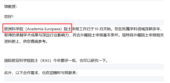 此外,对方在邮件中还提到,其可以满足的合作需求包括国际交流合作、各省市重点人才计划的申报支持、地方政府合作、奖项申报服务等。可以协助对接欧洲科学院、美国国家科学院、美国国家工程院、美国艺术与科学院等顶尖机构的院士,及诺贝尔奖获得者,搭建学术交流与合作。