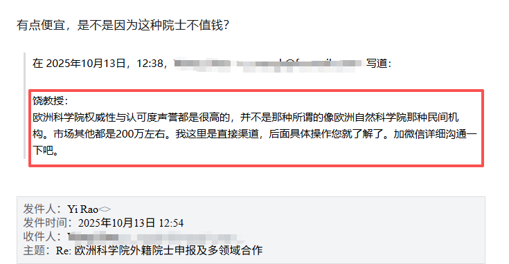 面对饶毅教授关于“价格偏低是否因院士不值钱”的质疑,对方在后续邮件中还表示,“欧洲科学院权威性与认可度声誉都是很高的,并不是那种所谓的像欧洲自然科学院那种民间机构。市场其他都是200万左右。我这里是直接渠道,后面具体操作您就了解了。”