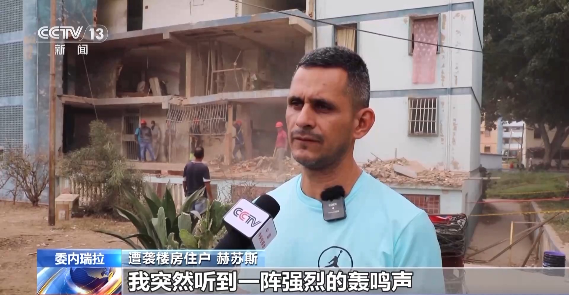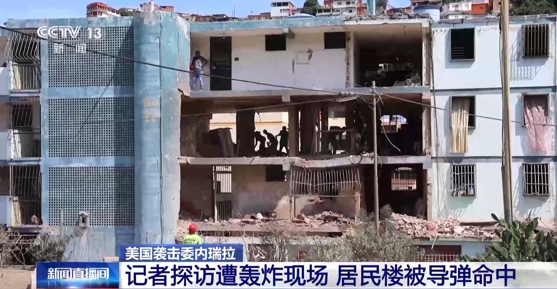 总台记者 廖开迪:我现在是在委内瑞拉北部的拉瓜伊拉州。在我身后是一栋被炮火波及的居民楼。可以看到,这栋楼受损严重,只剩下一片残骸,目前已经无人居住。