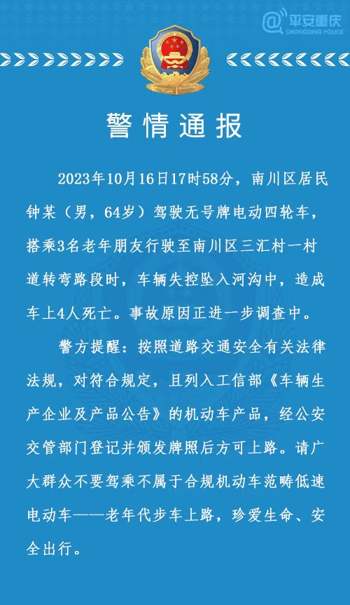 10月17日下午,南川区公安局微信公众号发布警情通报称,16日17时58分,南川区居民钟某(男,64岁)驾驶无号牌电动四轮车,搭乘3名老年朋友行驶至南川区三汇村一村道转弯路段时,车辆失控坠入河沟中,造成车上4人死亡。事故原因正进一步调查中。