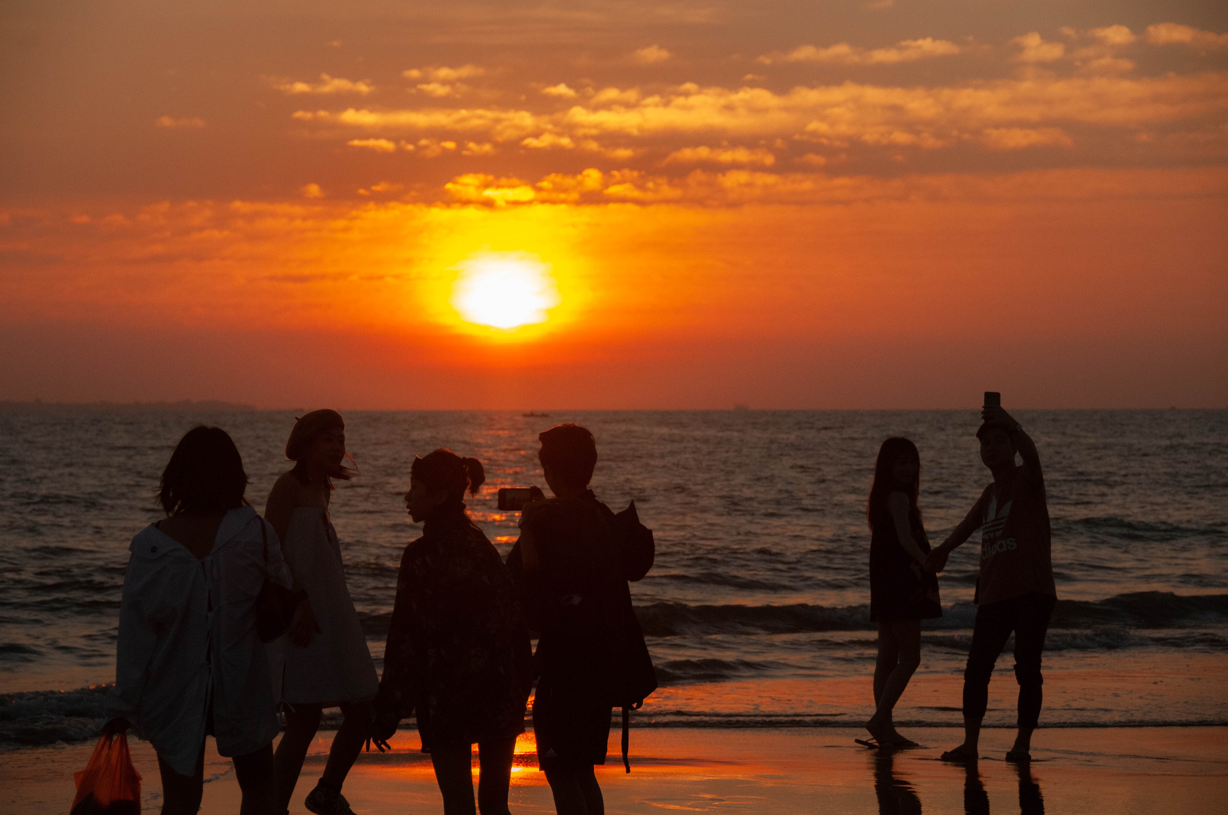 人们在海南三亚海滩欣赏夕阳美景。新华社记者 张鑫超 摄