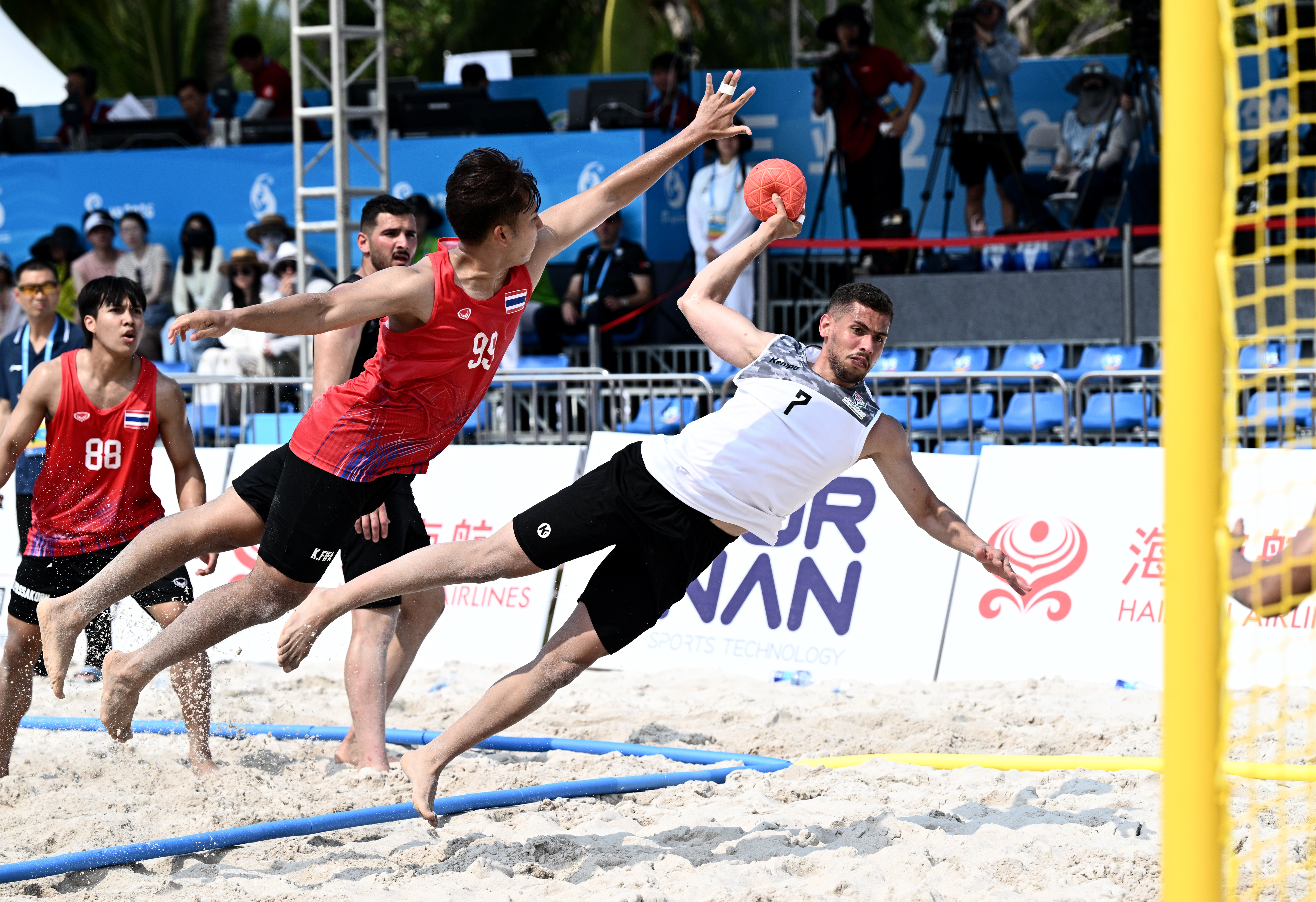 4月21日,沙滩手球开赛,这是三亚亚沙会的首个开赛项目。 新华社记者 杨冠宇 摄看点二:海上竞技,“变量”更多