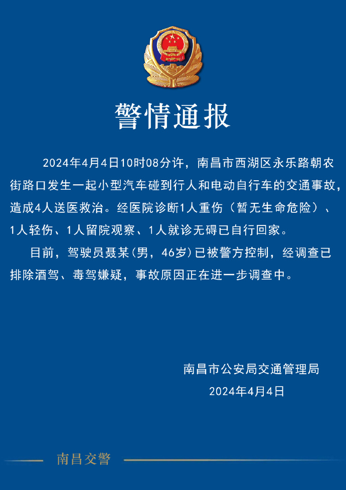 记者从江西省南昌市公安局交通管理局了解到,2024年4月4日10时08分许,江西省南昌市西湖区永乐路朝农街路口发生一起小型汽车碰到行人和电动自行车的交通事故,造成4人送医救治。经医院诊断1人重伤(暂无生命危险)、1人轻伤、1人留院观察、1人就诊无碍已自行回家。
