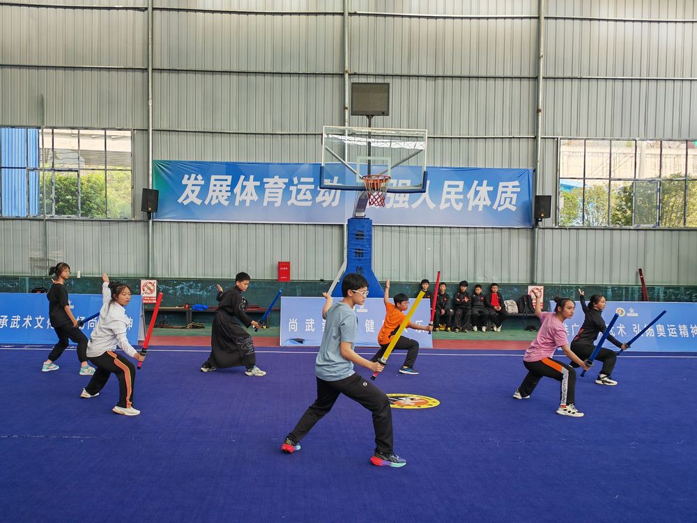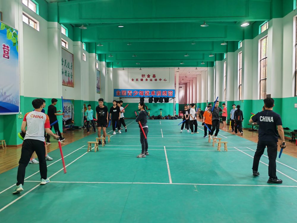 跑动声、击打声、吼叫声……在位于织金县双堰街道星秀社区的织金县全民健身中心的训练场上,23位少年正在两位教练的带领下,激情澎湃地开展武术兵道(短兵)训练。
