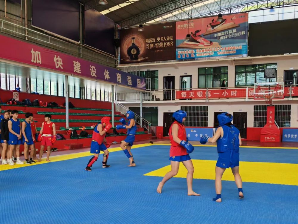 在绮陌街道鑫雨篮球馆的两块场地上,散打和武术套路的训练也在同步进行。几十位散打队员身着护具,戴着拳套,雨点般的挥拳动作发出啪啪啪的击打声,伴随着他们的嘶吼,震撼人心。