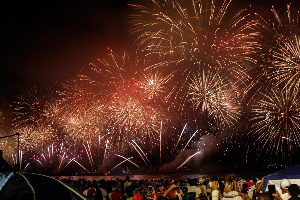 2024年1月1日凌晨,在巴西里约热内卢科帕卡巴纳海滩,人们观看焰火表演迎新年。新华社发(克劳迪娅·马尔提尼摄)