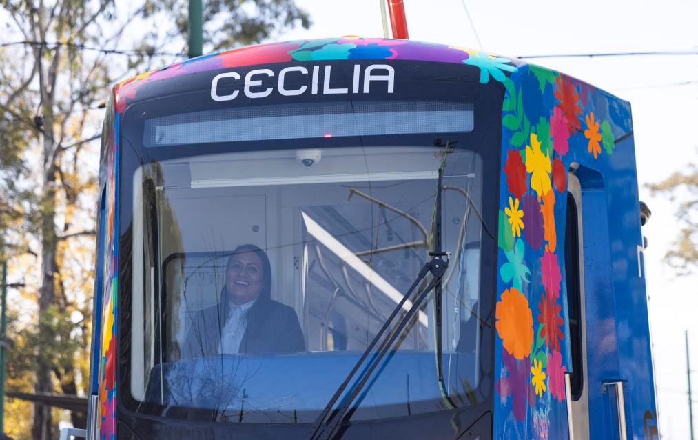 1月3日,在墨西哥首都墨西哥城,轻轨列车驶入一处轻轨站。中国中车为墨西哥首都墨西哥城研制的轻轨列车3日投入商业运营,这是中国制造的轻轨列车首次服务墨西哥城公共交通系统。新华社记者李梦馨摄
