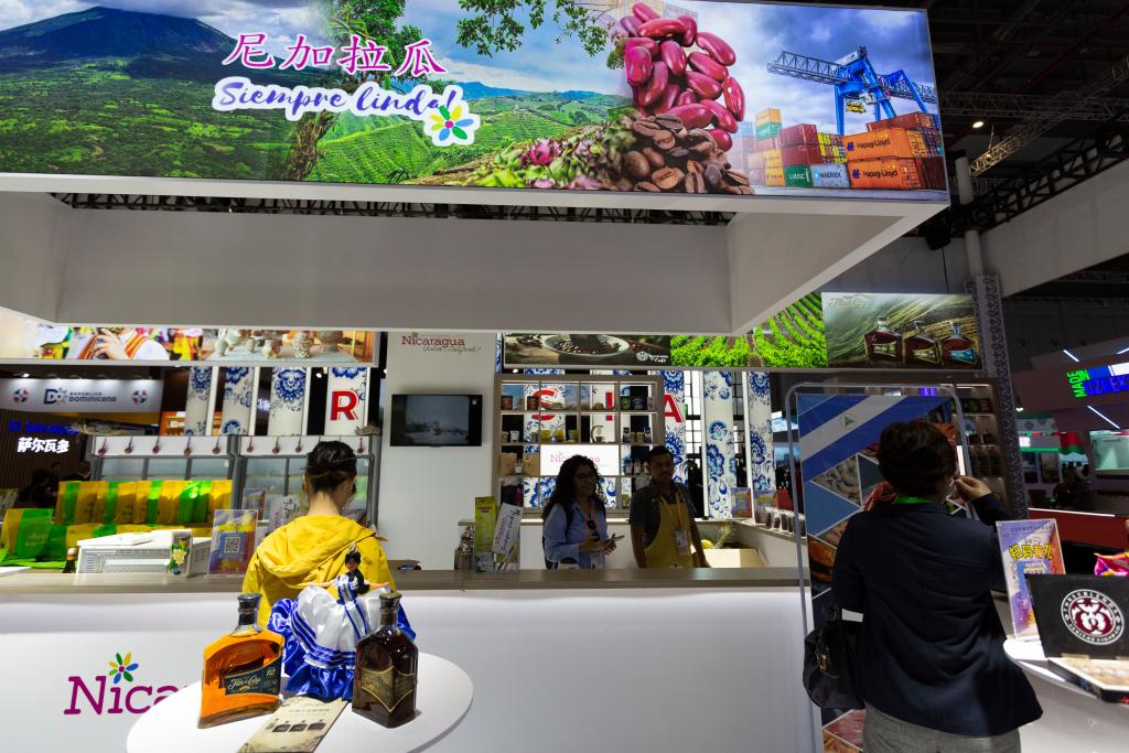 这是2023年11月6日在第六届进博会国家展拍摄的尼加拉瓜展台。新华社记者高巍摄