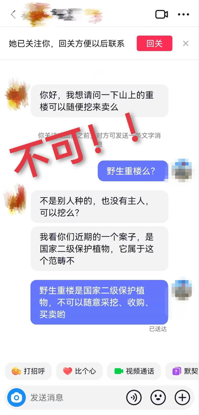野生重楼看似没有“主人”,实则属于国家二级保护植物。根据《中华人民共和国刑法》第三百四十四条:违反国家规定,非法采伐、毁坏珍贵树木或者国家重点保护的其他植物的,或者非法收购、运输、加工、出售珍贵树木或者国家重点保护的其他植物及其制品的,将构成危害国家重点保护植物罪!