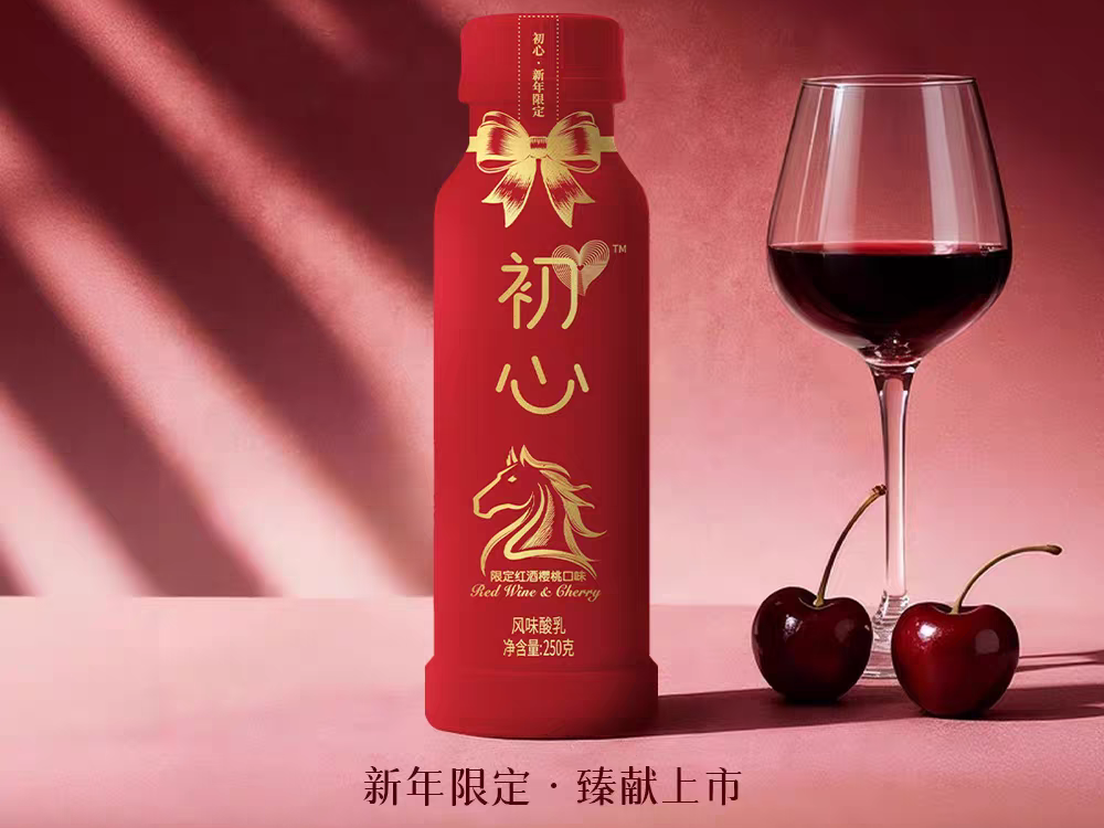 今年新希望华西乳业,专为春节档准备的初心樱桃红酒酸奶,采用新年限定包装,红色瓶身满满祝福意味,特别彰显“心”意。