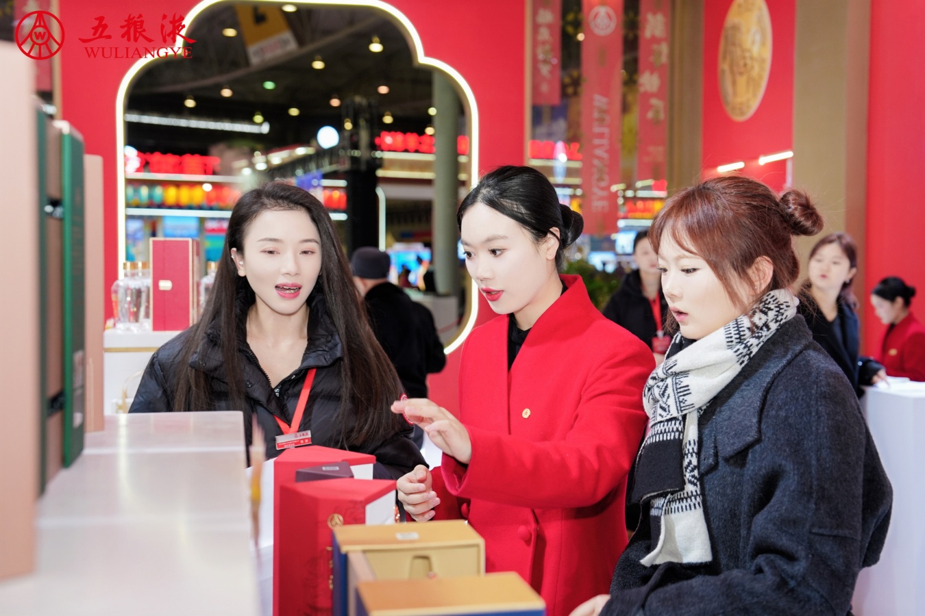 “五粮液,让年味更浓”。为方便市民采购年货,五粮液今年特别参加了成都的新春年货节,在世纪城3号展馆内设立了品牌展厅,准备了丰富的年货大礼包,心意满满。“五粮液,礼敬中国年”。据五粮液工作人员介绍,在年货节现场,五粮液全系产品悉数亮相,向市民开放销售,包括丙午马年生肖酒、29°五粮液·一见倾心等,另外还有五粮液仙林生态青梅酒、果味气泡酒等,以及 中国三大高山红茶之一的川红工夫茶。