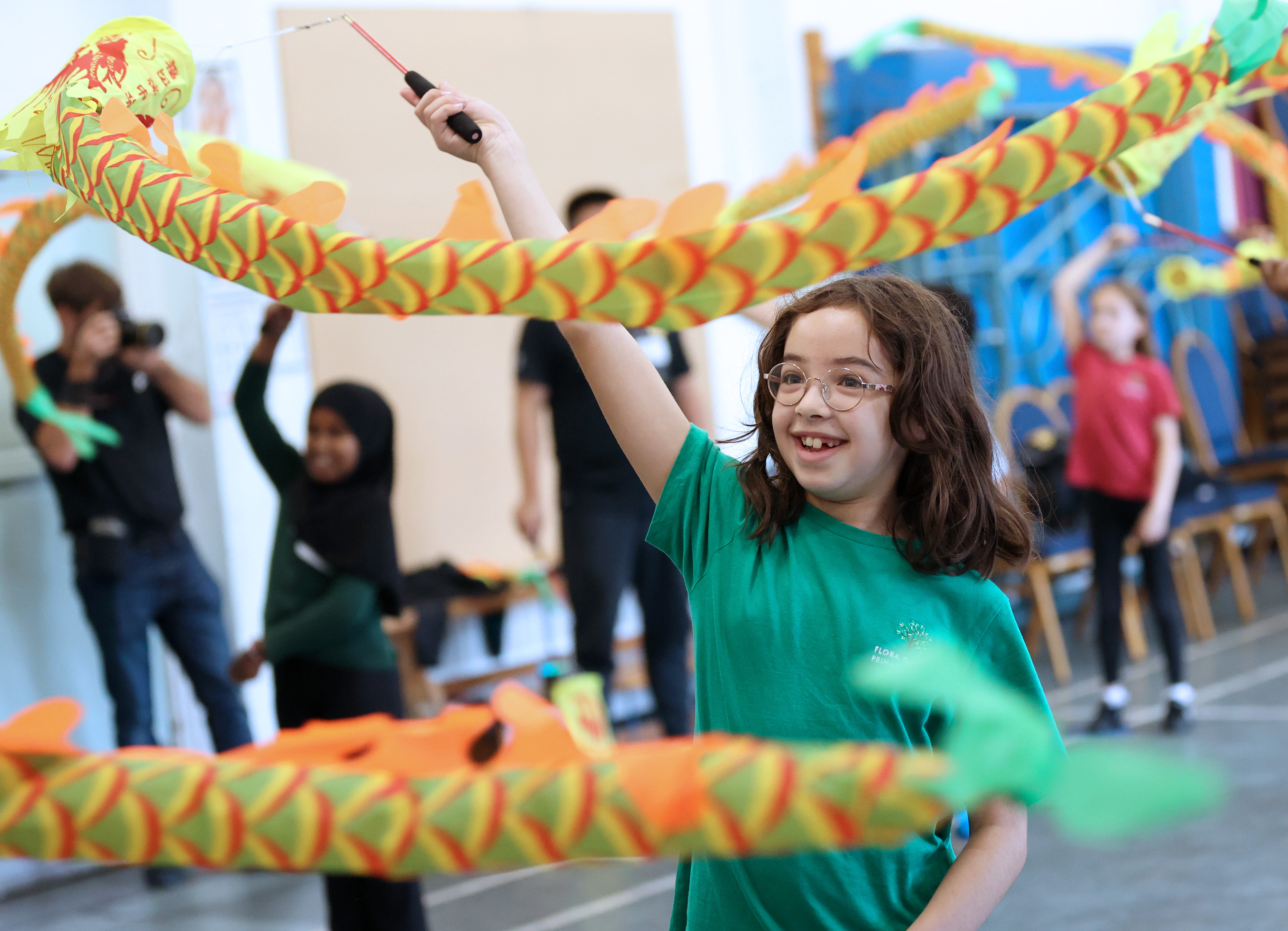 10月2日,英国伦敦弗洛拉花园小学学生在中国体育教师曾科的武术课上舞动彩带龙。新华社记者 李颖 摄