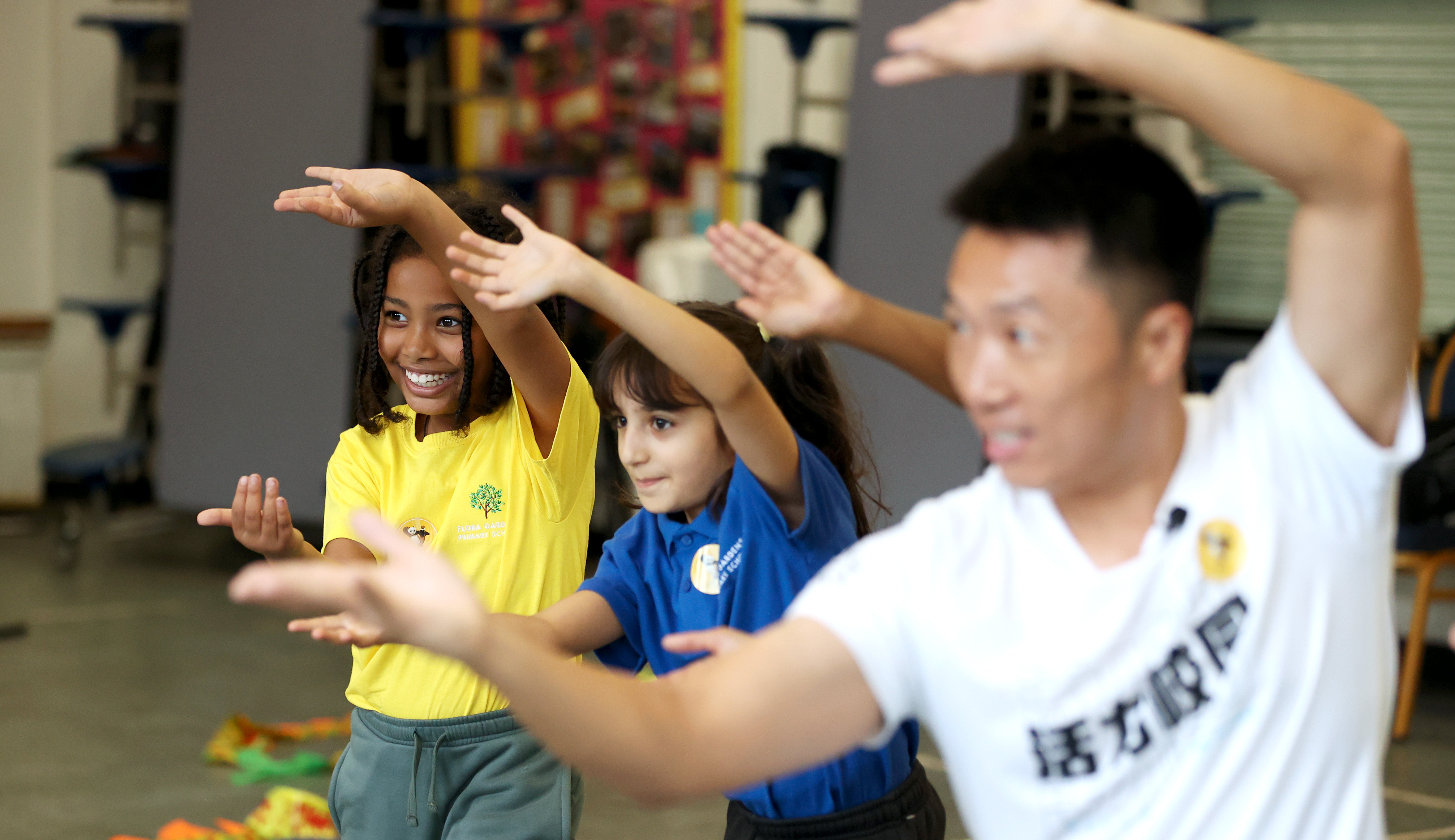 10月2日,英国伦敦弗洛拉花园小学学生跟随来自中国的体育教师曾科学习武术动作。新华社记者 李颖 摄