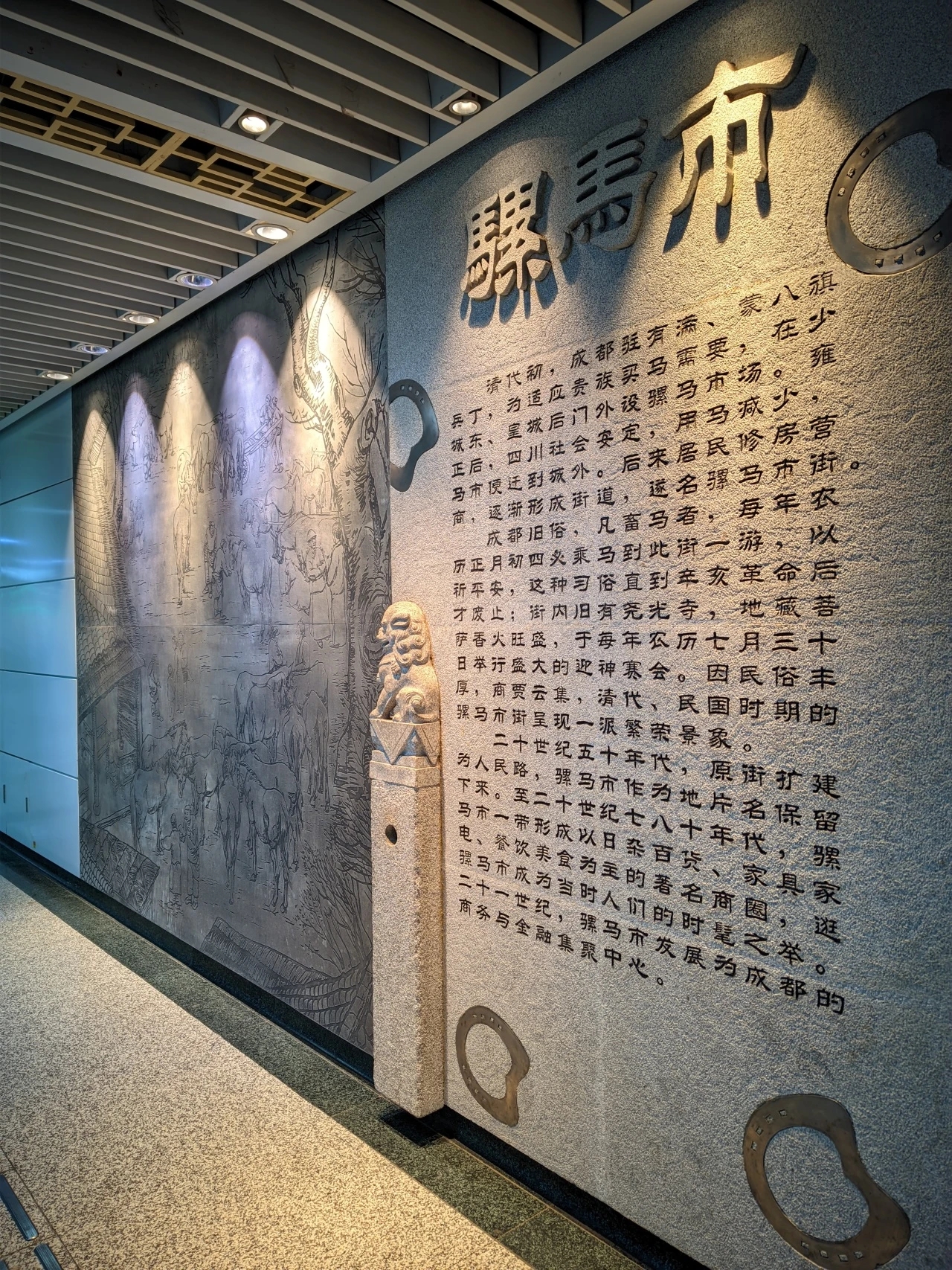 更绝的是这里的 “车管所规则”,比现在的年检还严。每匹马入市前都得烙专属火印,既能防偷又能溯源,想混进病马?门儿都没有。还有专门的 “马牙行” 当中间人,就像现在的二手车评估师,帮着买卖双方谈价,还得负责核验马匹 “身份”。到了清代后期,马市迁到城外,但 “骡马市” 这个名字,愣是被成都人留到了现在。今天在地铁骡马市站,墙上还有“拴马桩”的元素。