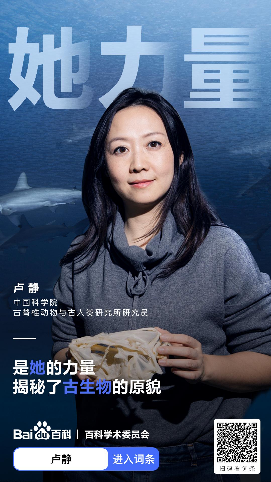 卢静,女,博士,国家优秀青年基金获得者。中国科学院古脊椎动物与古人类研究所研究员,主要从事古鱼类学,特别是早期硬骨鱼类演化研究。在百度百科上,卢静的介绍有满满几屏。