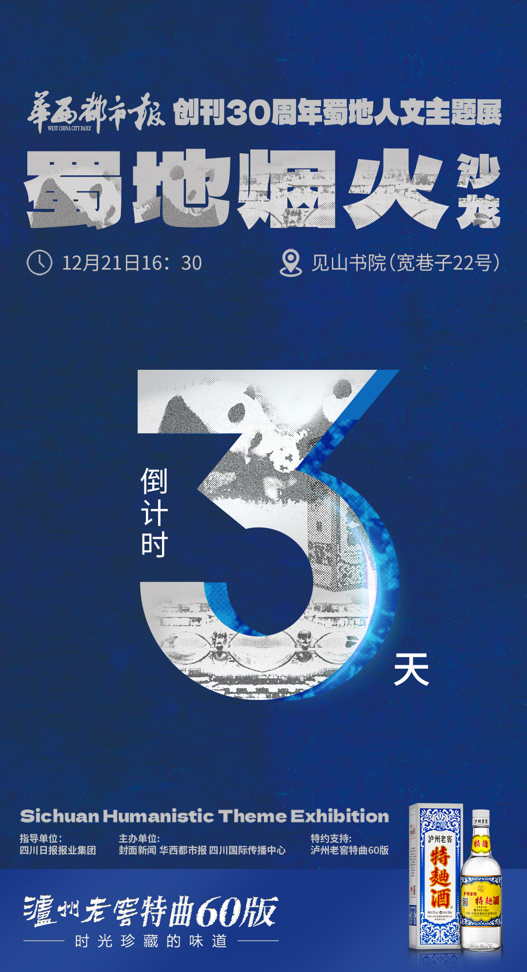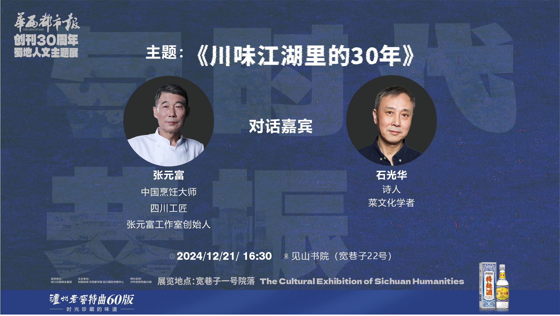 12月21日下午16:30,由四川日报报业集团指导,封面新闻、华西都市报主办,四川国际传播中心联合主办,泸州老窖特曲60版特约支持的“与时代共振——华西都市报创刊30周年蜀地人文主题展”文化沙龙将在成都宽窄巷子迎来收官。届时,中国烹饪大师、张元富工作室创始人张元富,著名诗人、川菜文化学者石光华,将以《川味江湖里的30年》为题,围绕川菜历史演进的时代性、大众传播与川菜文化、川菜产业发展趋势、川菜与川酒等议题展开深度对话。