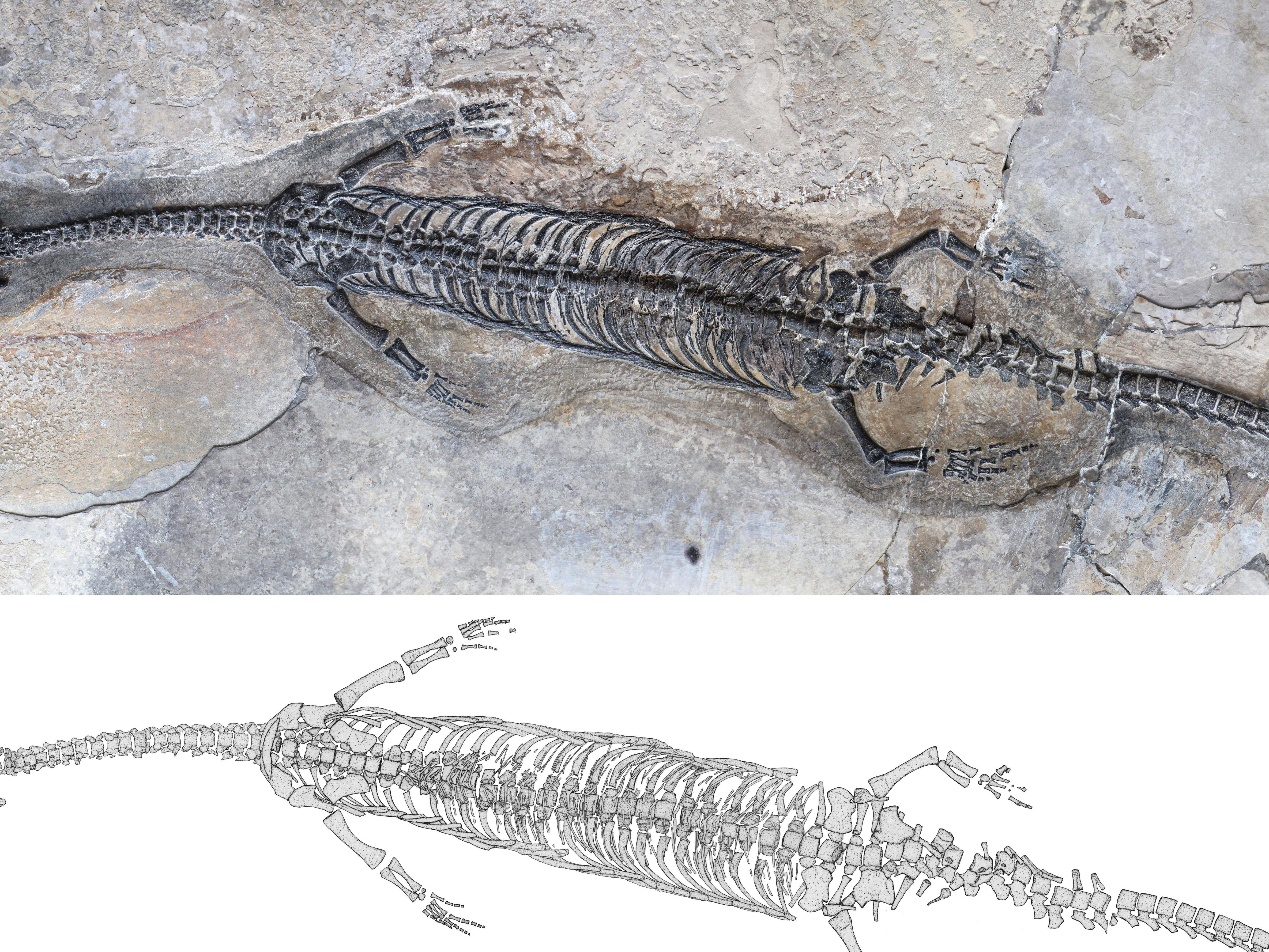 尖嘴长吻的“四脚蛇”化石,全长超过半米。中科院古脊椎动物与古人类研究所科研人员在云南省罗平县中三叠世海相地层(2.44亿年前)发现一种新的肿肋龙科爬行动物,代表了多指节型鳍龙类最早出现的化石记录,将其命名为“奇异罗平龙”。相关成果日前发表在国际学术期刊《科学报告》上。
