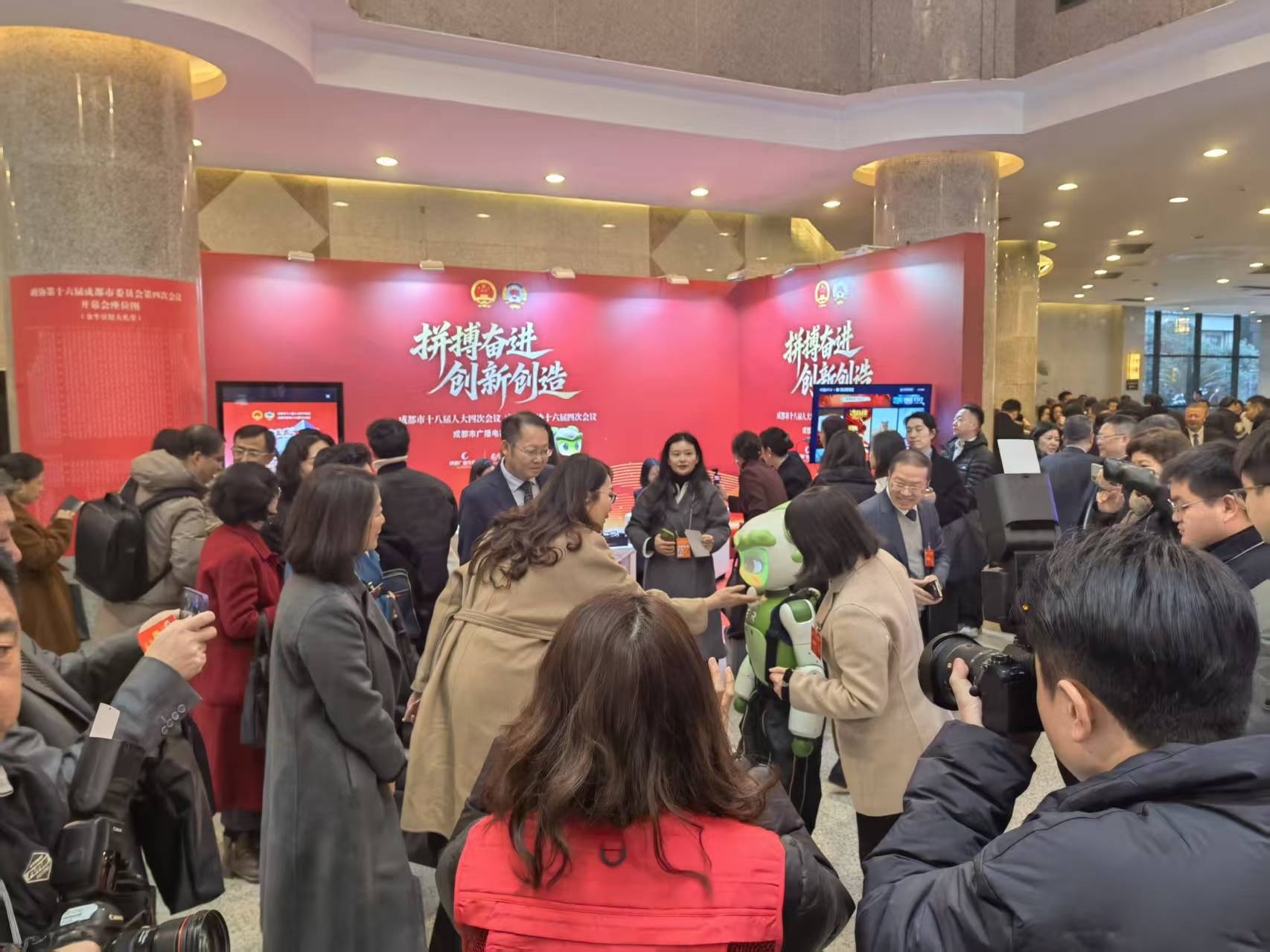 1月28日,成都两会现场,一只热情好客、善于交流的“小话痨”——“爱湫”机器人,自如地与参会嘉宾互动。