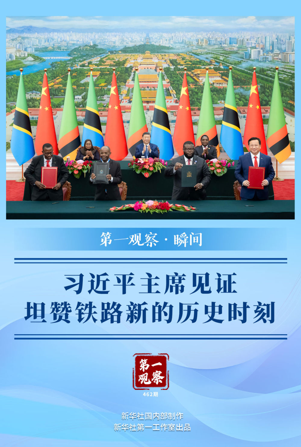 新华社记者用镜头记录下又一历史时刻——习近平主席同来华出席中非合作论坛北京峰会的坦桑尼亚总统哈桑、赞比亚总统希奇莱马,在这里共同见证签署《坦赞铁路激活项目谅解备忘录》。签署完毕,现场热烈的掌声经久不息。