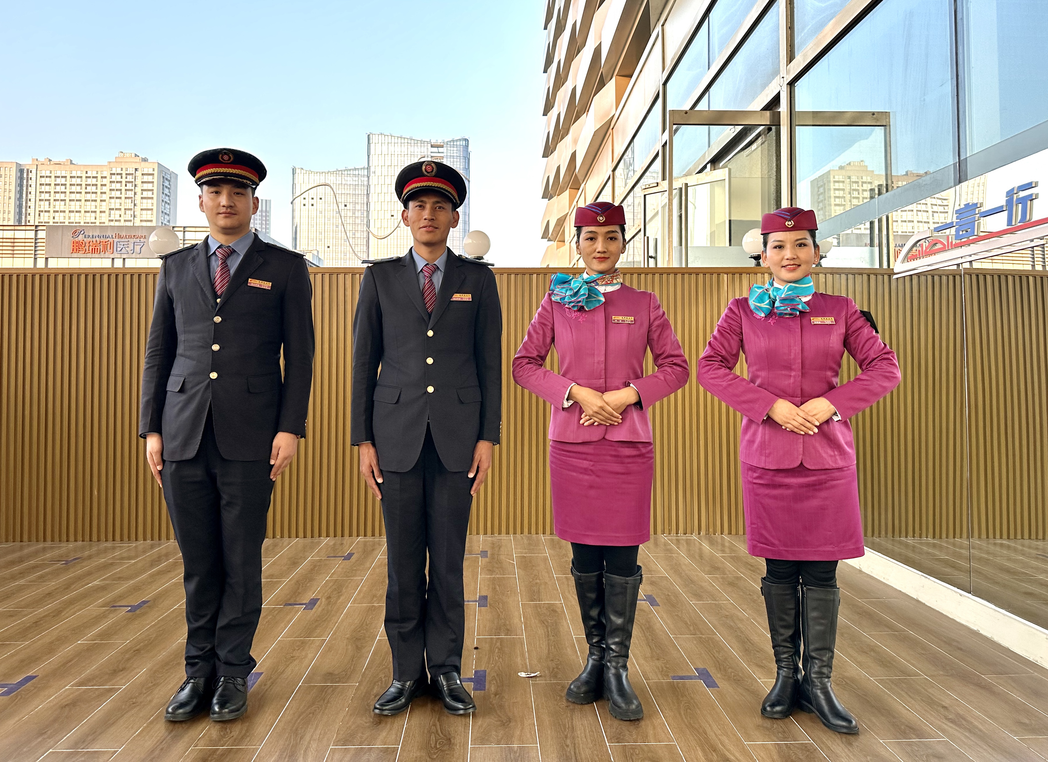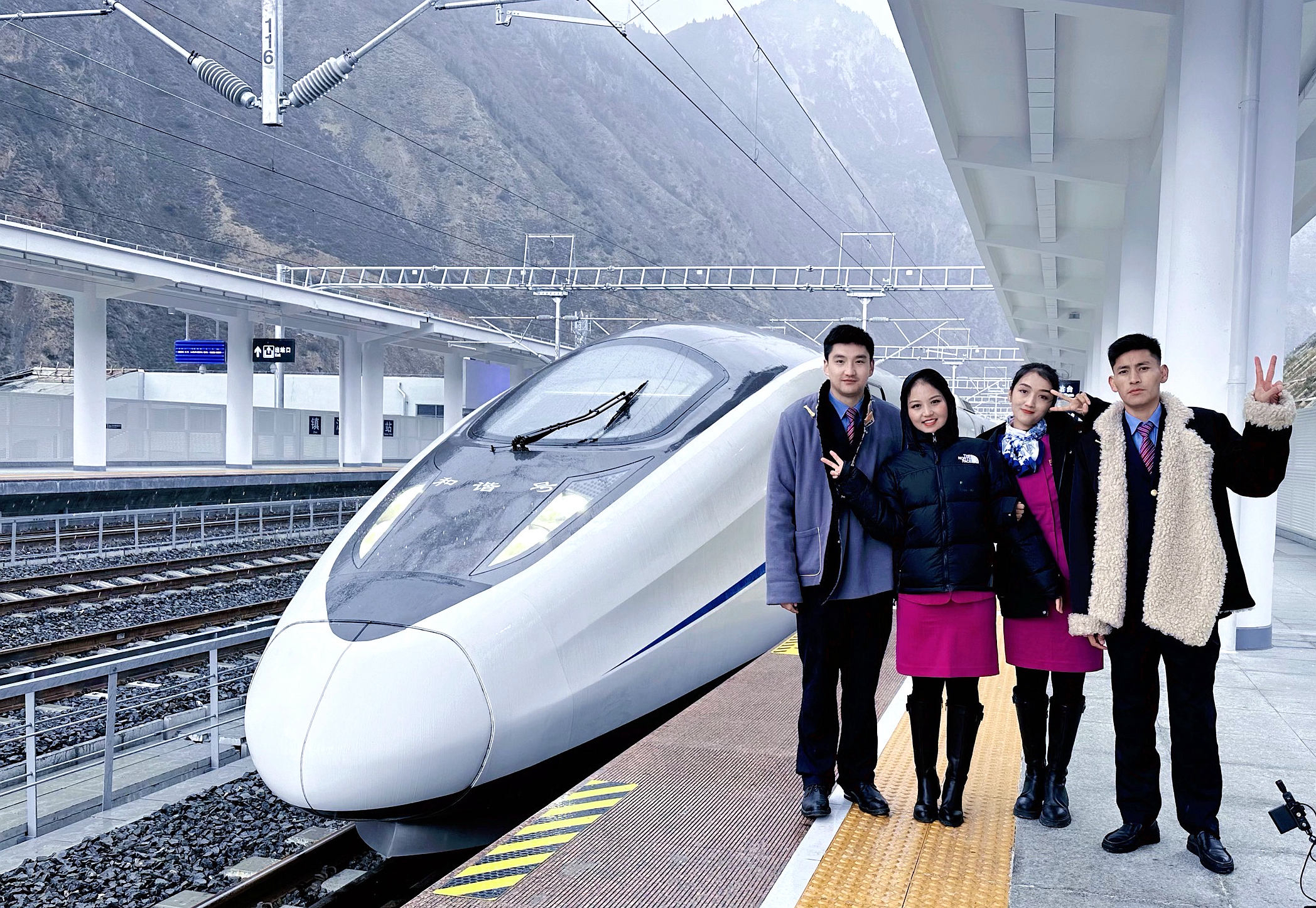 首发列车上,用青初、冬拉、俄尖泽里、灯更罗吾4名来自阿坝州的藏族乘务员组成“高原格桑花班组”,用当地语言亲切服务旅客。作为列车长,用青初对这天期待已久:于私,铁路修进阿坝州,80岁的外婆第一次见到了动车,她很开心;于公,铁路将家乡美食、文化带到更广阔的世界,她成为交流互通的助力者,倍感荣幸。