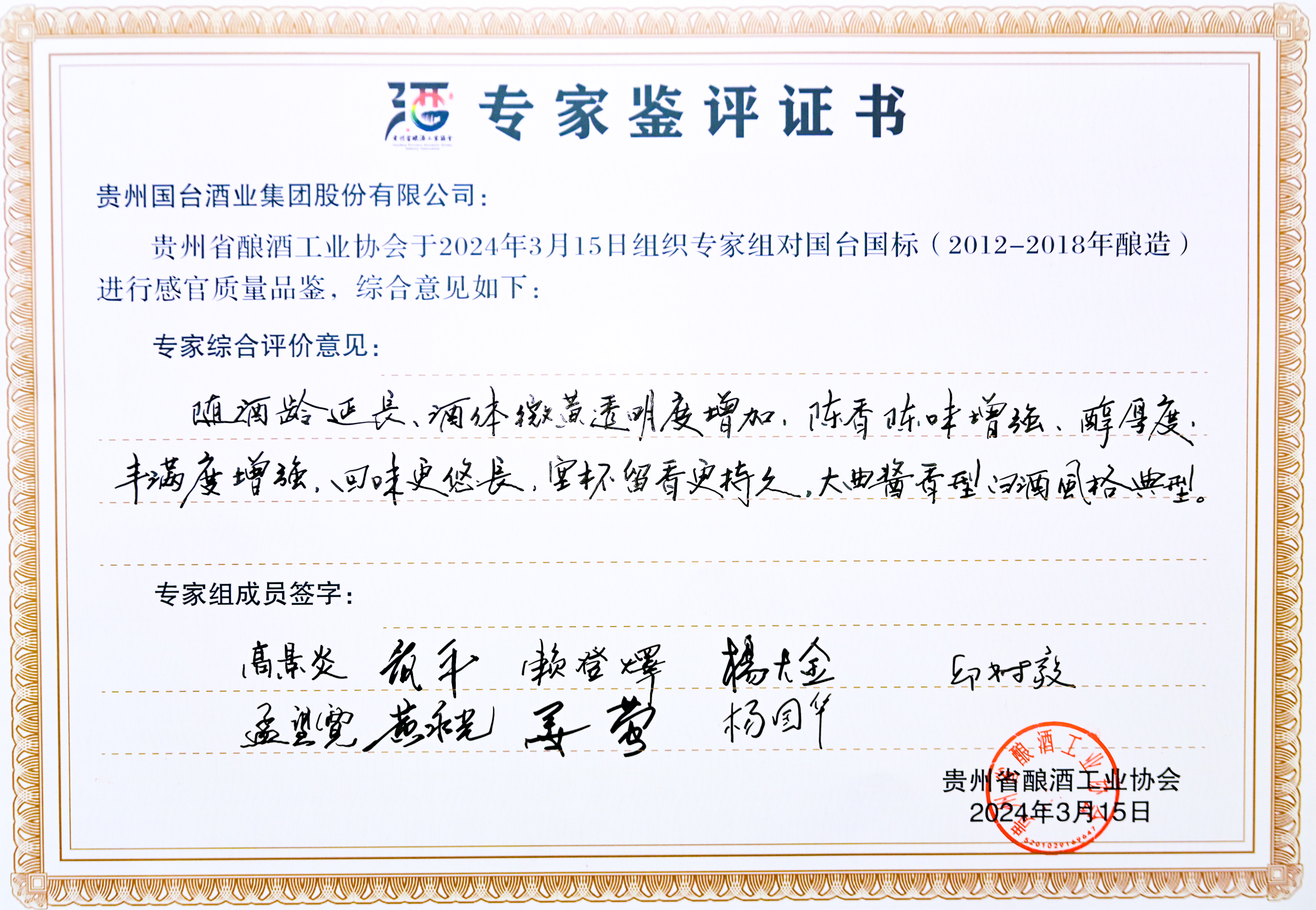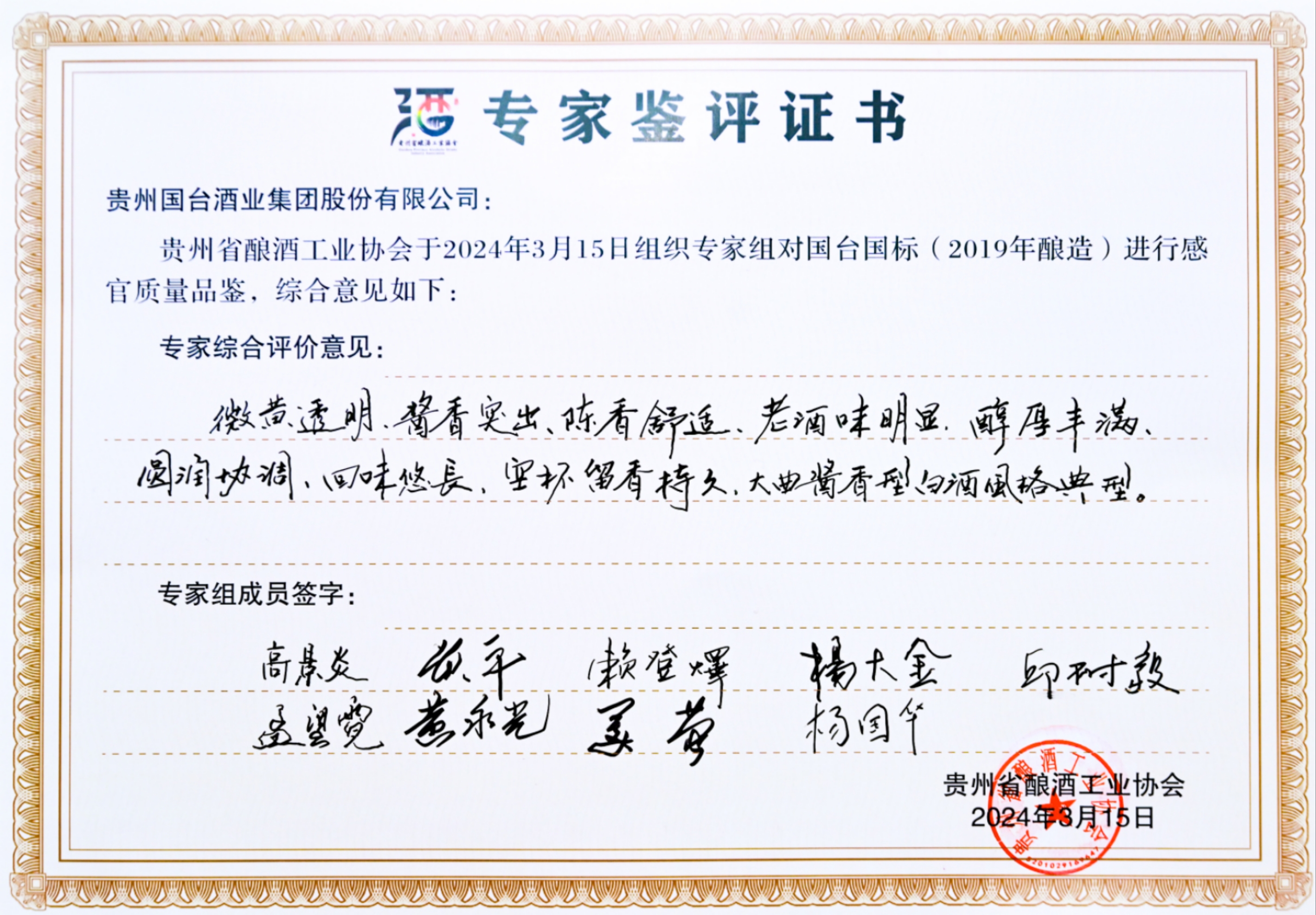 其中,国台国标酒(2019年酿造)意见为:微黄透明、酱香突出、陈香舒适、老酒味明显。醇厚丰满、圆润协调、回味悠长,空杯留香持久,大曲酱香型向酒风格典型。